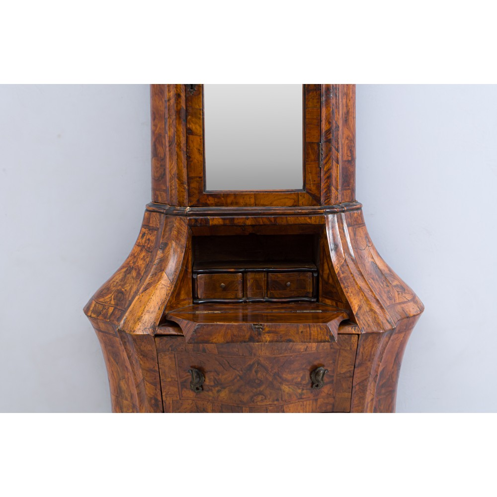 Piccolo trumeau in legno lastronato in radica di ulivo composto da corpo basso con due cassetti e piccola ribalta, corpo alto da vetrina ad anta singola con specchio a mercurio.