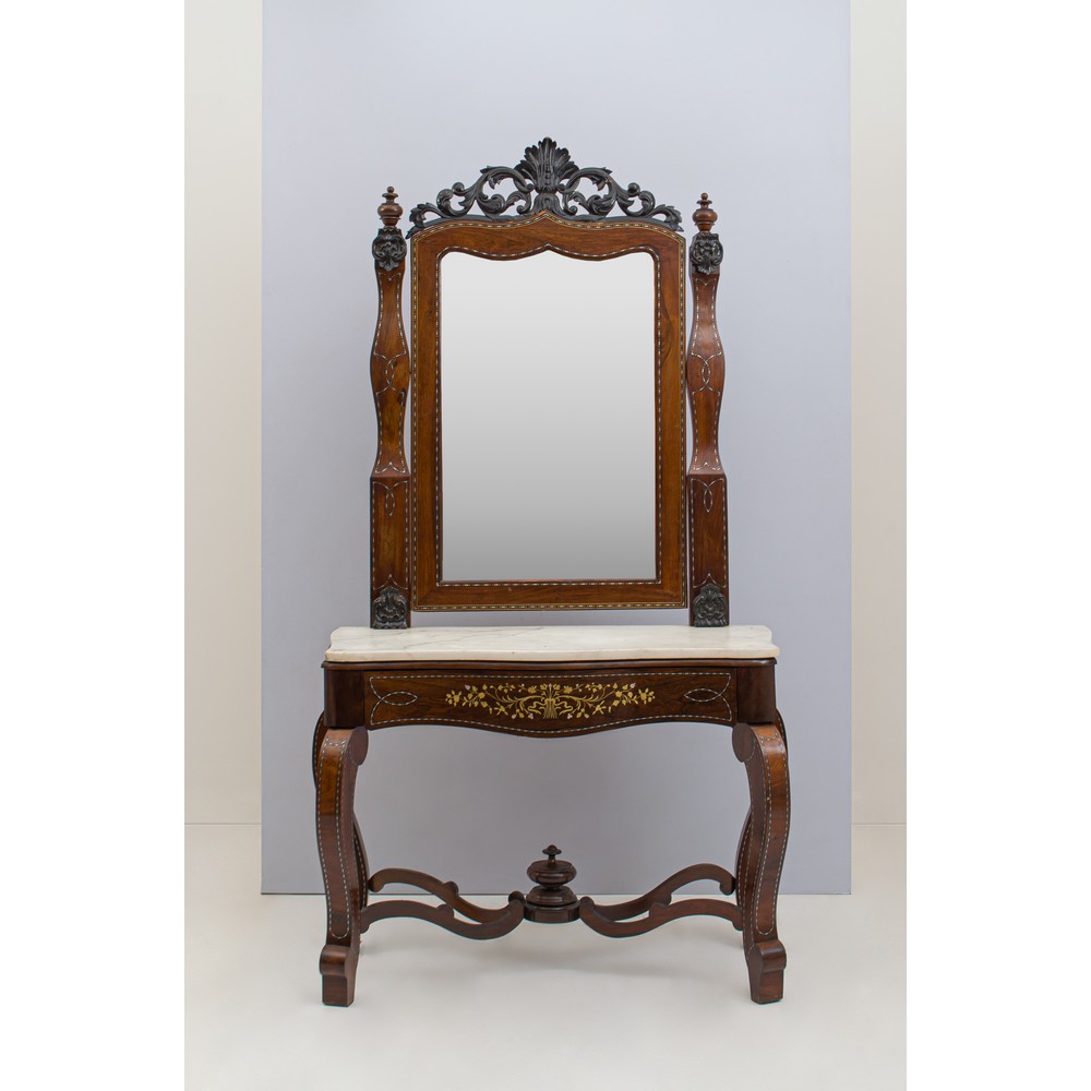 Toletta di epoca Luigi Filippo lastronata con legni esotici, tarsie e perfili in bosso, rame, madreperla e zinco.