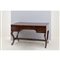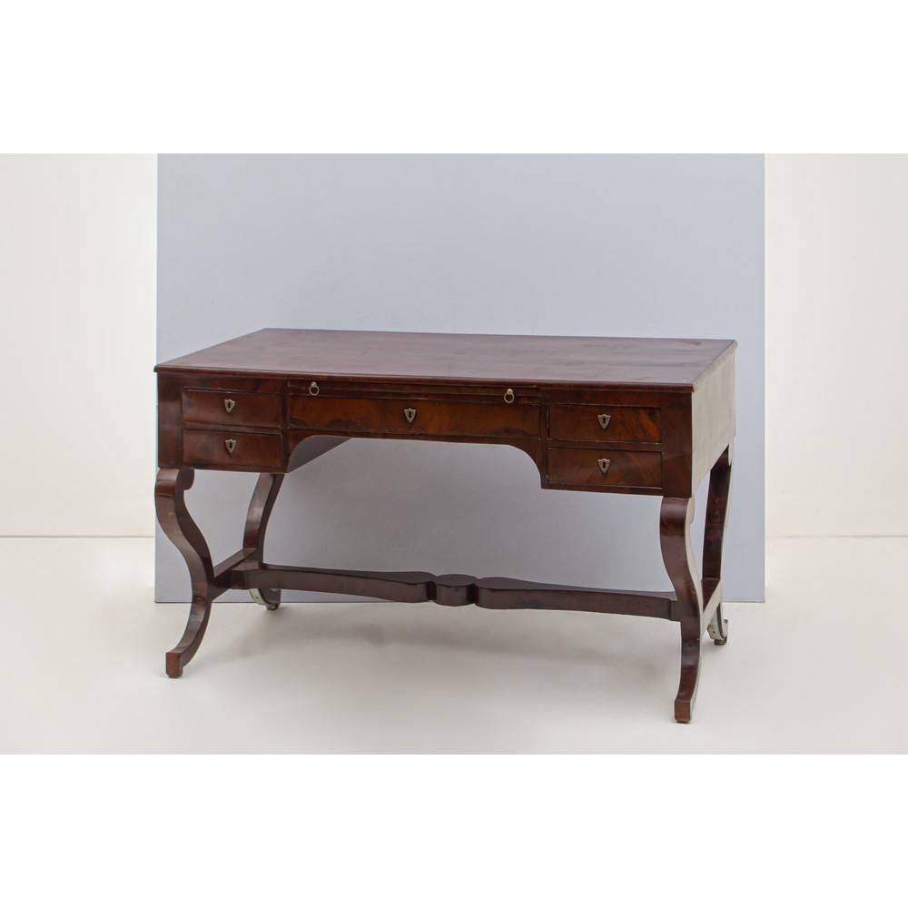 Scrivania di epoca Luigi Filippo lastronata in legno di mogano con cassetto centrale sormontato da tiretto e due piccoli cassetti per lato.