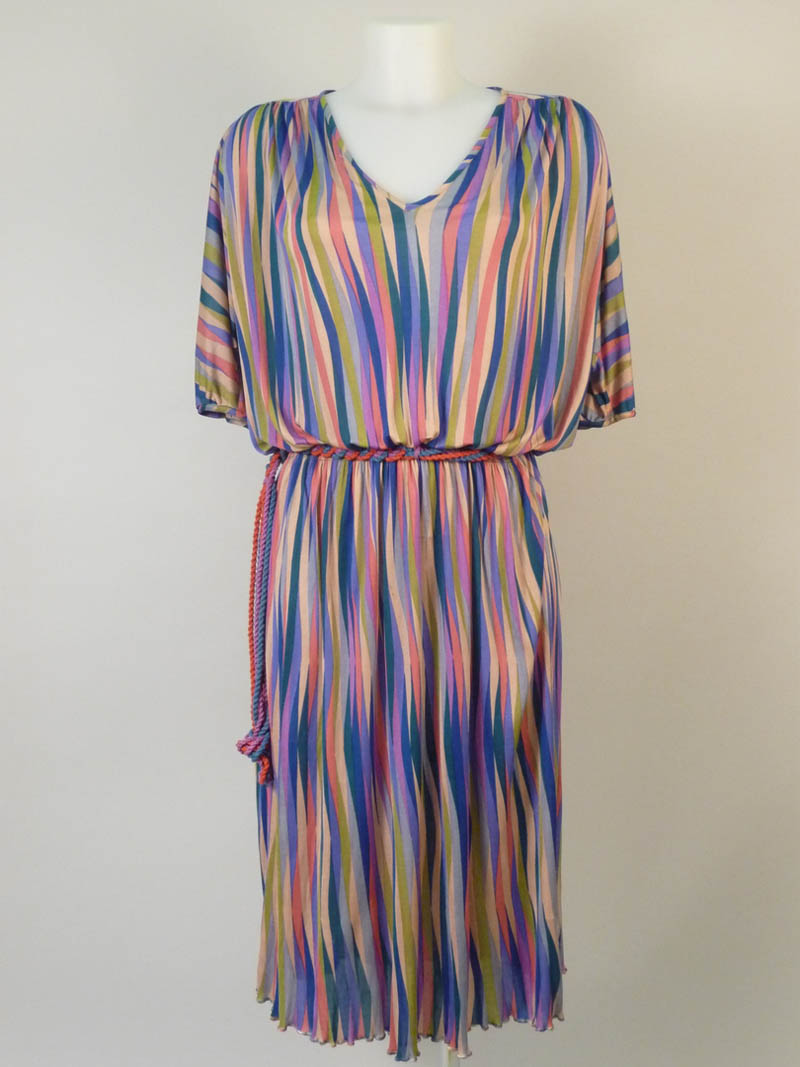 ABITO IN JERSEY A FANTASIA - JERSEY DRESS Missoni nei toni del viola, rosa e verde, cintura abbinata in cotone intrecciato, difetti tg M circa