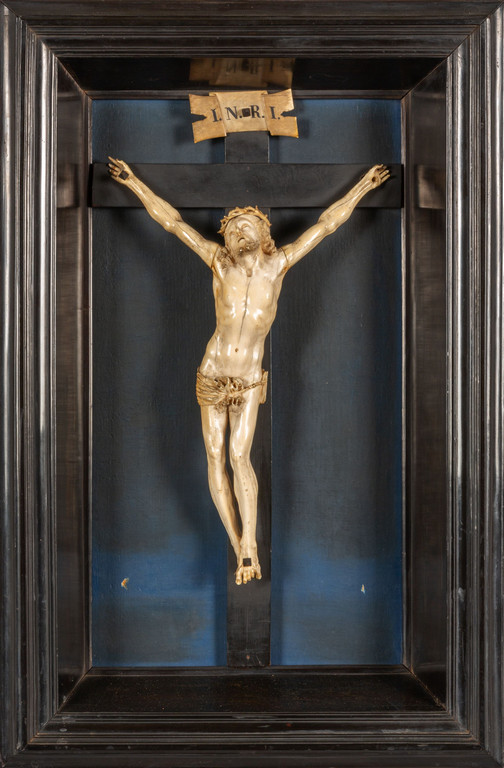 Cristo in avorio artista francese del sec.XVIII bacheca in legno ebanizzato