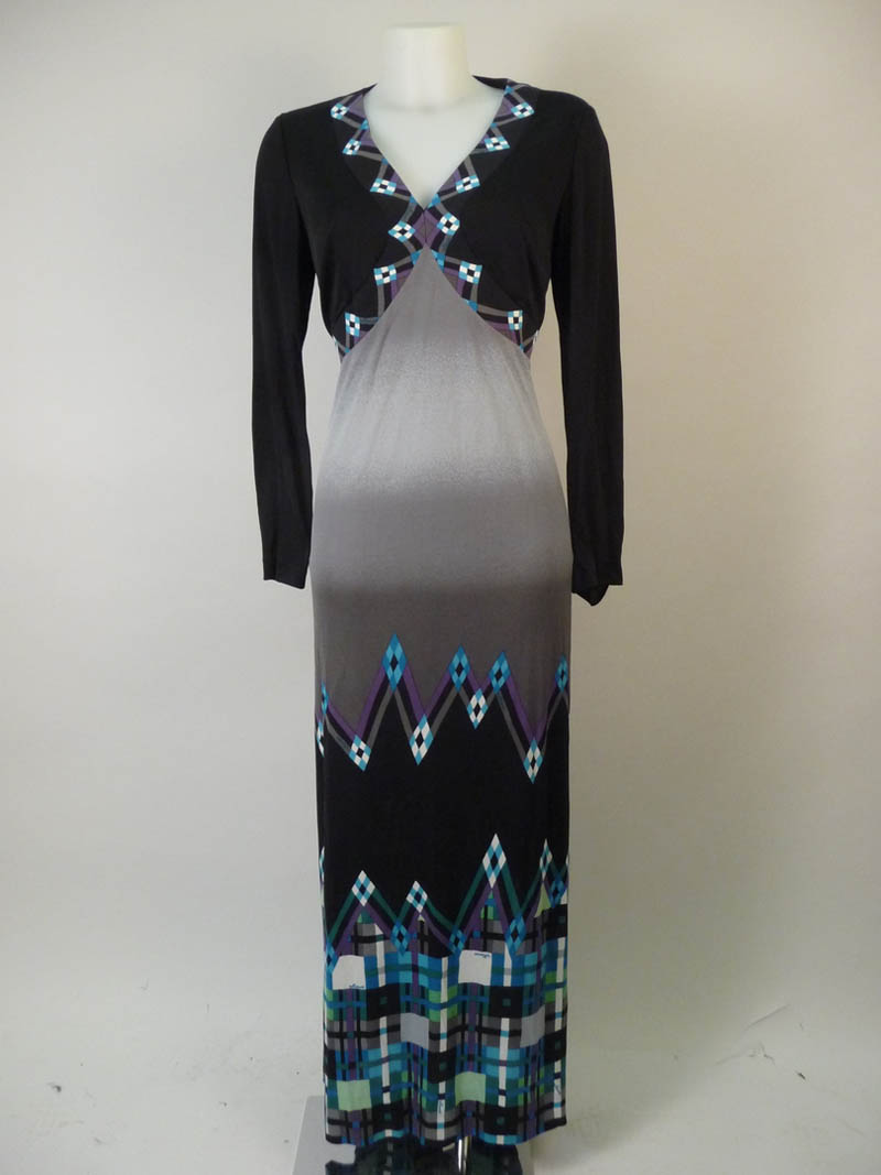ABITO IN JERSEY - JERSEY DRESS Hermitt a fantasia nei toni dell' azzurro, scollo a V, modello lungo decorato con motivi geometrici nei toni del blu, viola e verde su fondo in gradazione del nero tg M circa