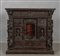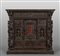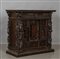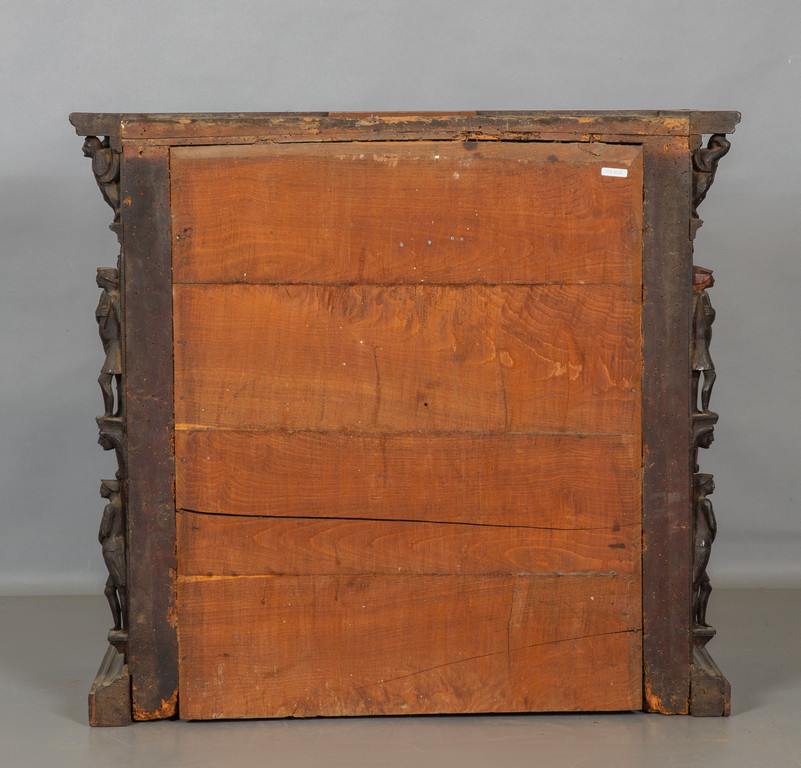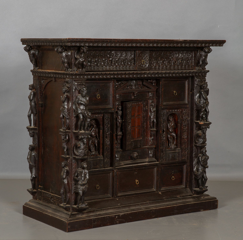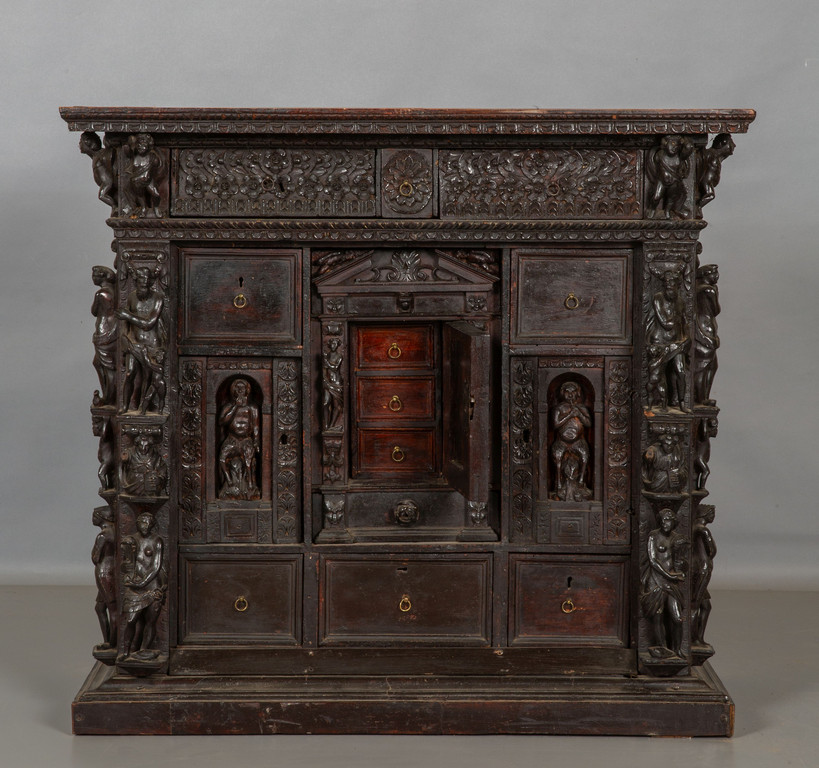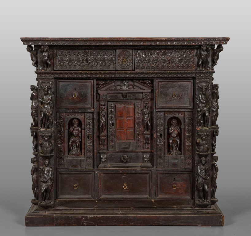 Stipo in noce finemente intagliato con la classica decorazione a doppi bambocci nei montanti sul fronte e ripetuto nel retro. Due cassetti grandi ed uno sotto il piano altri sei cassetti e tre sportelli centrali di cui due con nicchie con statue.