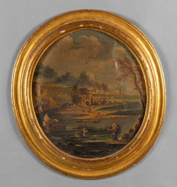 Scuola piemontese sec.XVIII 'Gesù e San Pietro' olio di forma ovale cornice coeva in legno intagliato e dorato