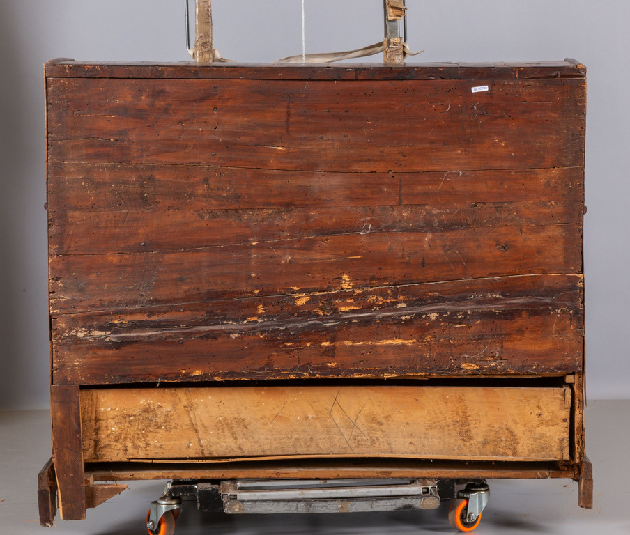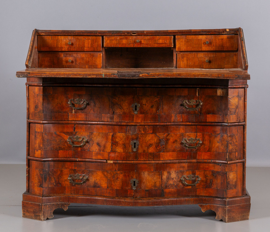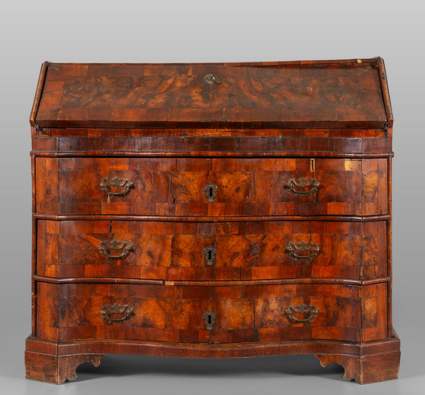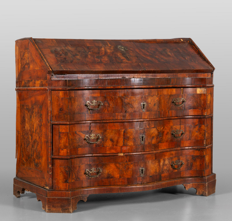 Ribalta Luigi XIV movimentata sul fronte lastronata in noce e radica di noce tre cassetti Veneto I metà sec.XVIII