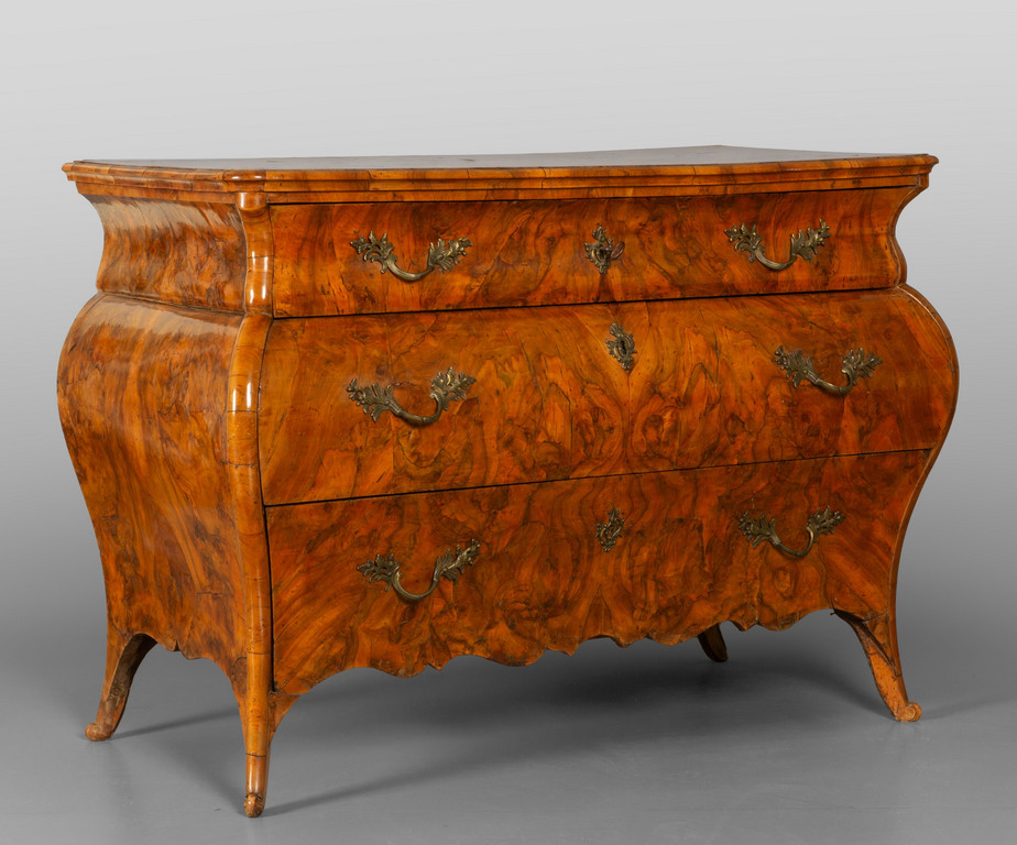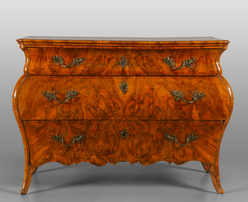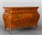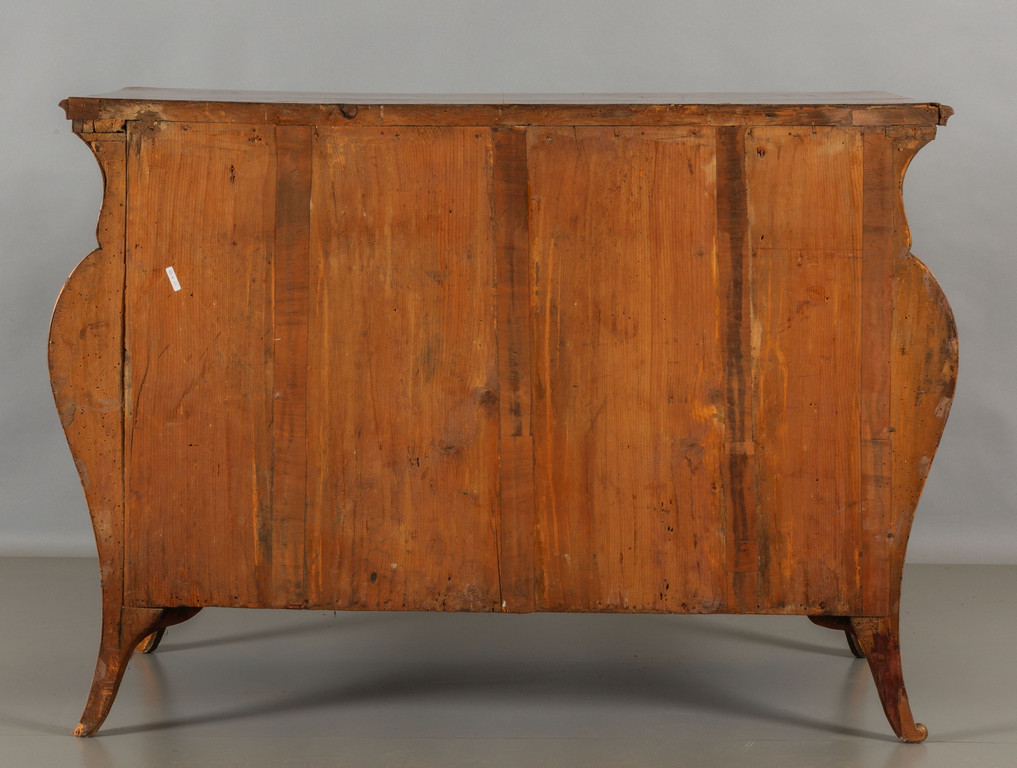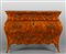 Comò Luigi XV movimentato sul fronte e sui fianchi due cassetti più uno sul fronte lastronato in radica piano coevo lastronato in radica e filettato Lombardia I metà sec.XVIII