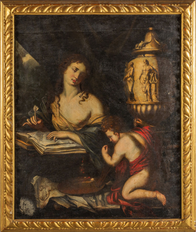 Scuola italiana sec.XVII 'Allegoria della scrittura' olio cornice in legno intagliato e dorato