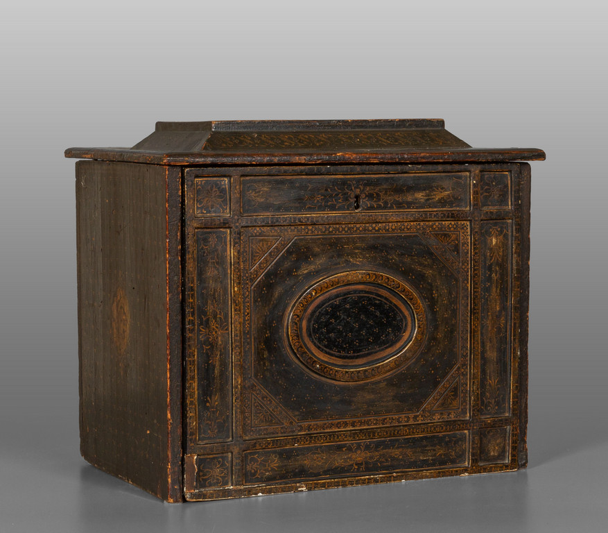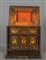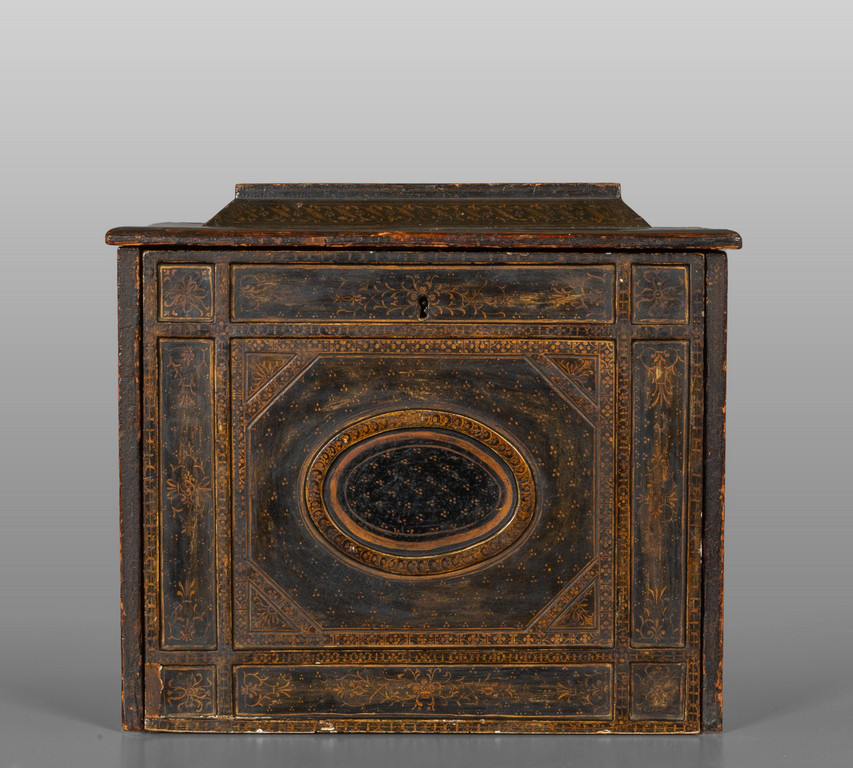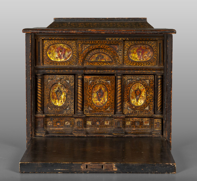 Stipo in legno ebanizzato e dorato all'interno quattro cassetti decorati con medaglioni con madreperla dipinta parte superiore con sportello che cela interno con segreti Venezia sec.XVI