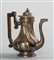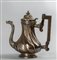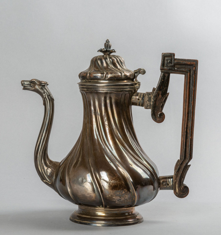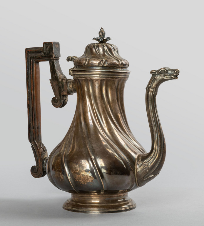 Caffettiera in argento sbalzato corpo a spirale coperchio a cerniera sormontata da pomolo arricchito da cartigli beccuccio a testa di drago manico in legno ebanizzato Genova punzone della Torretta ripetuto nel fondo e nel coperchio metà sec.XVIII
