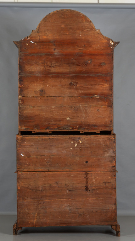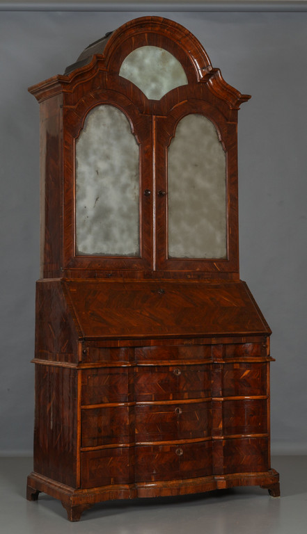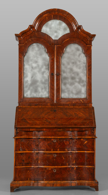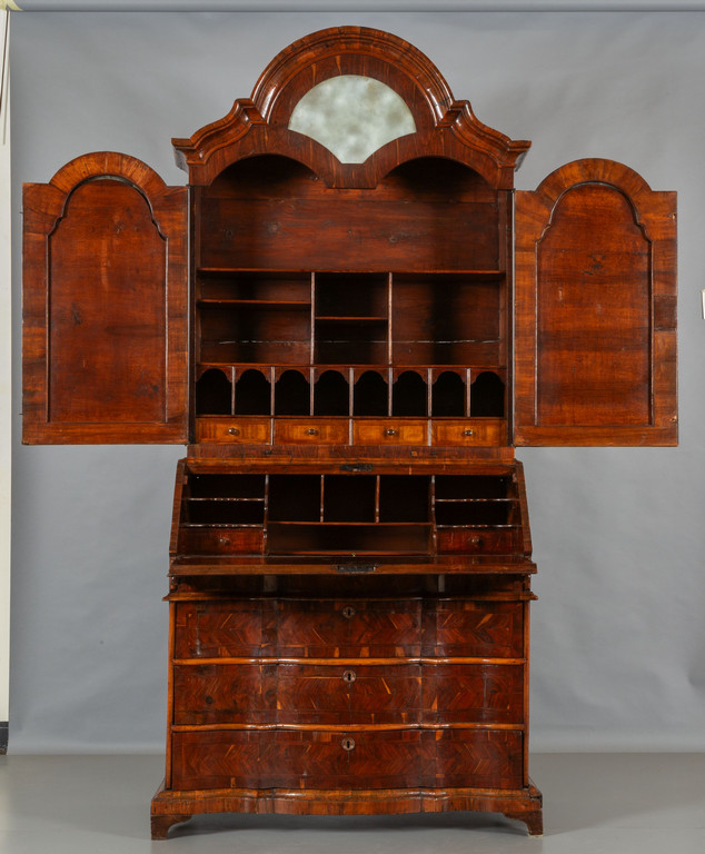 Mobile a doppio corpo lastronato in noce d'India parte inferiore con tre cassetti a triplice mossa parte superiore con cappello a carabiniere due sportelli con specchi e specchio superiore Veneto I metà sec.XVIII