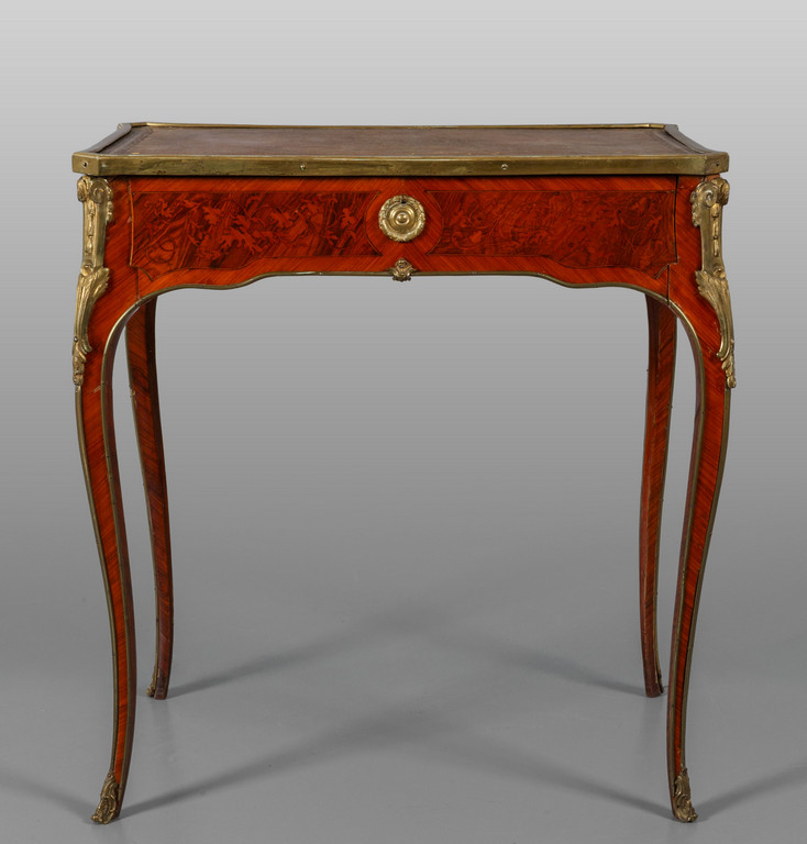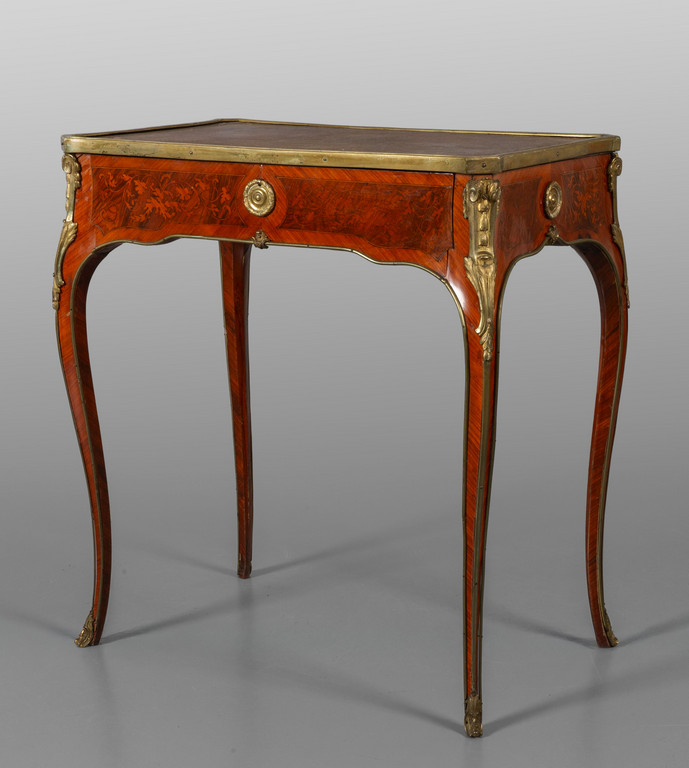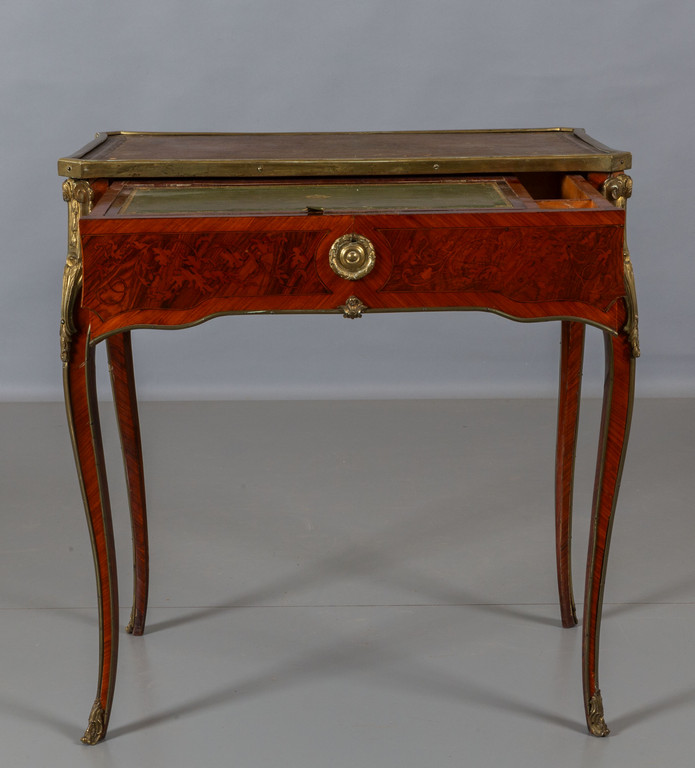 Piccolo scrittoio lastronato in bois de rose ed intarsiato in violetto ricca decorazione in bronzo dorato Francia I metà sec.XIX