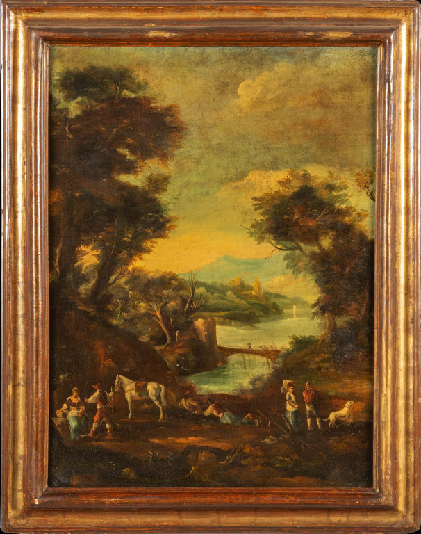 Scuola lombarda sec.XVIII 'Paesaggio fluviale con figure' olio cornice coeva in legno intagliato e dorato
