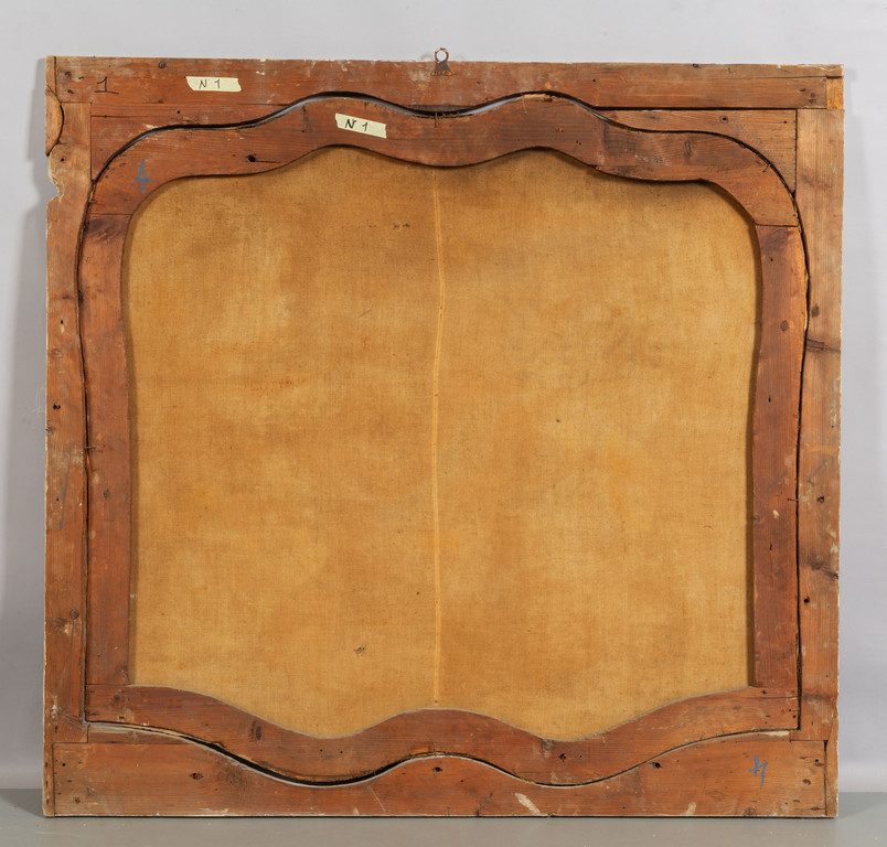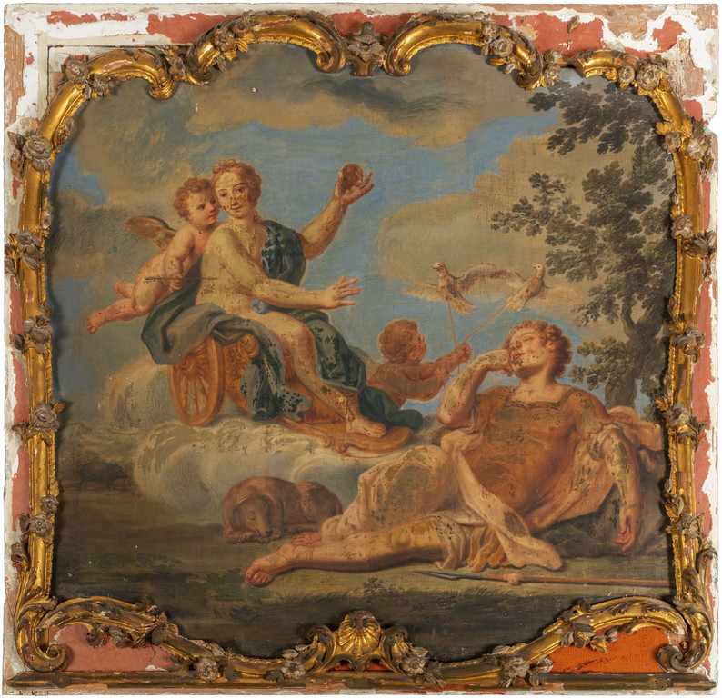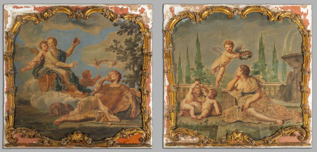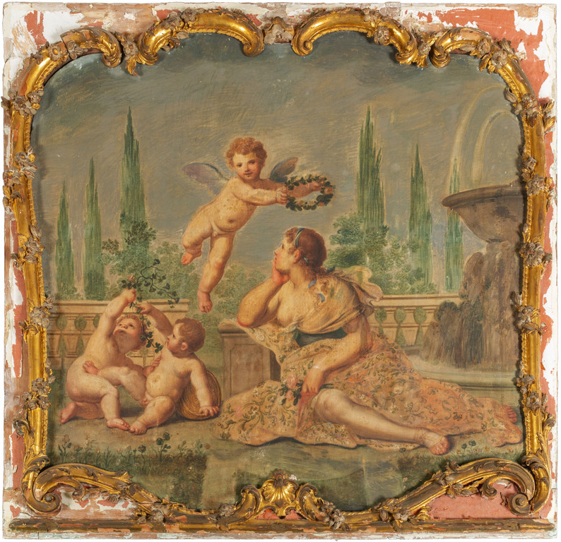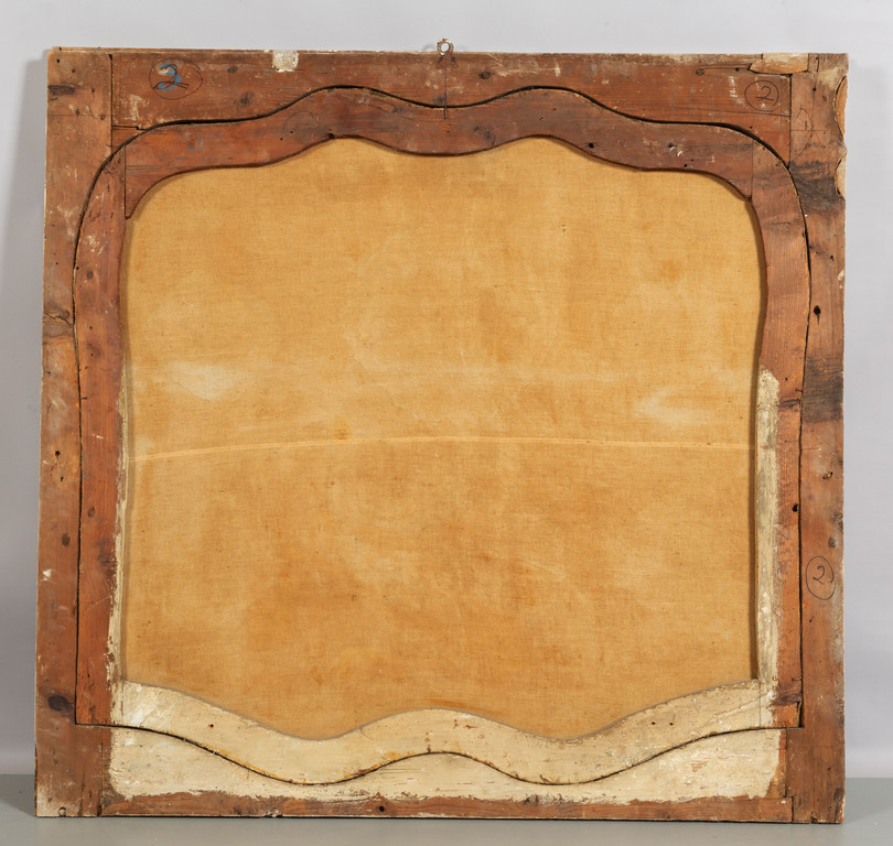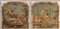 Scuola italiana sec.XVIII 'Scene mitologiche' coppia di tempere di forma sagomata belle cornici coeve in legno intagliato e dorato smontate e con mancanze