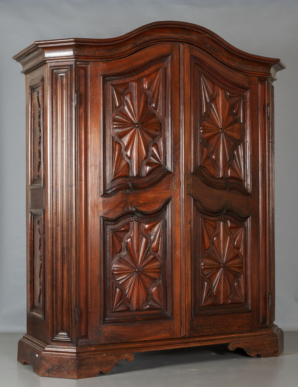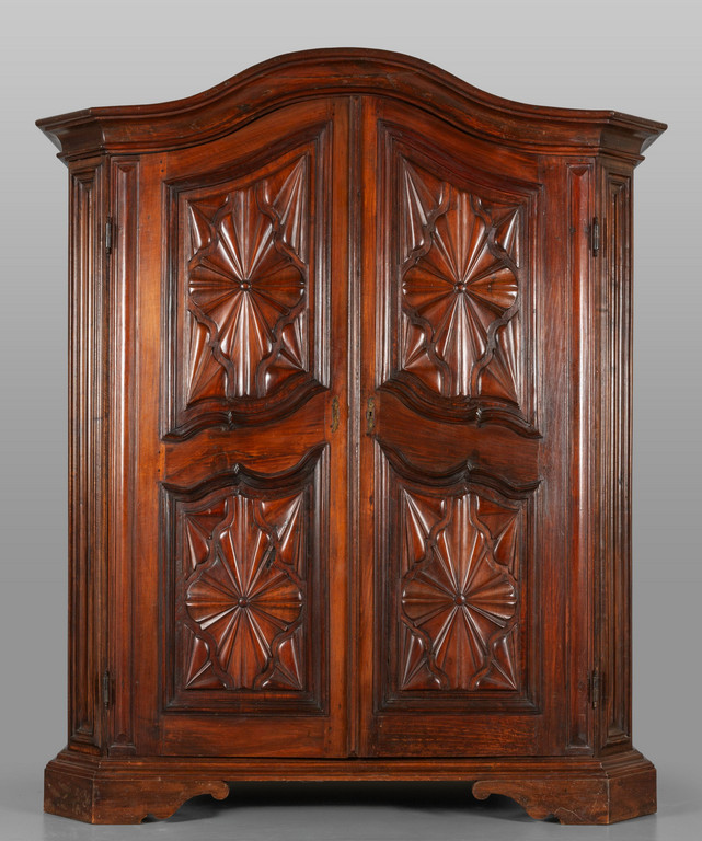 Armadio Luigi XIV in noce a due porte intagliate a punta di diamante fianchi scolpiti cappello a carabiniere Genova sec.XVIII