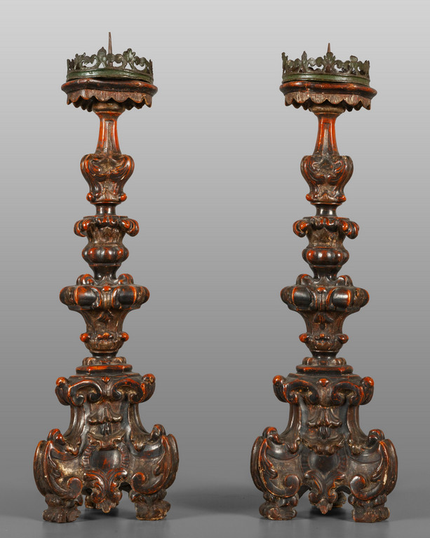 Coppia di candelieri Luigi XIV in legno intagliato e laccato sec.XVII