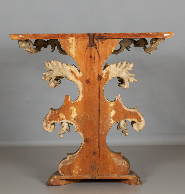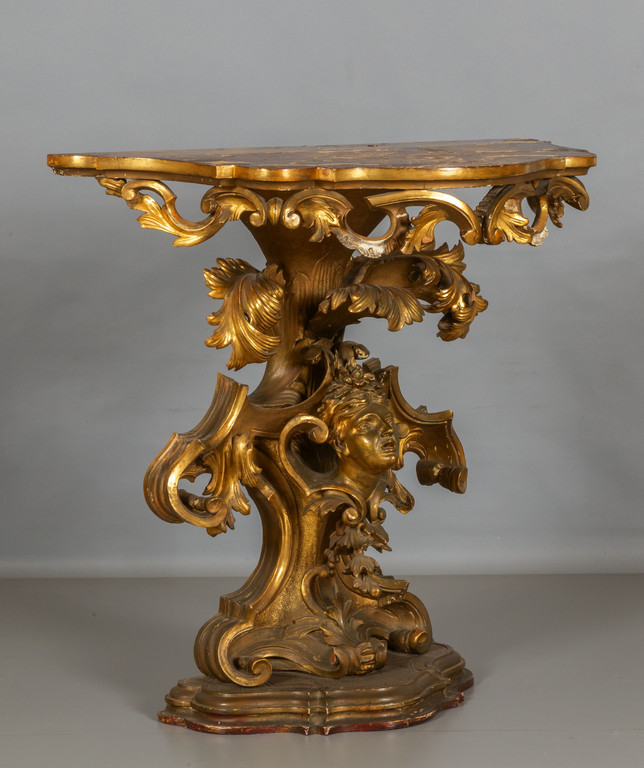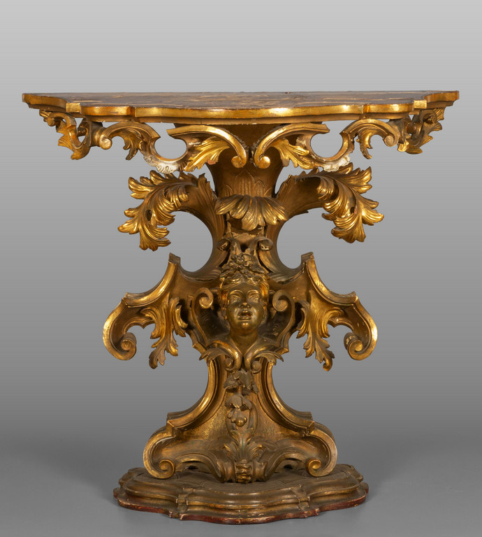 Console reggenza in legno intagliato con al centro testa femminile tra volute barocche piano decorato a finto marmo I metà sec.XVIII
