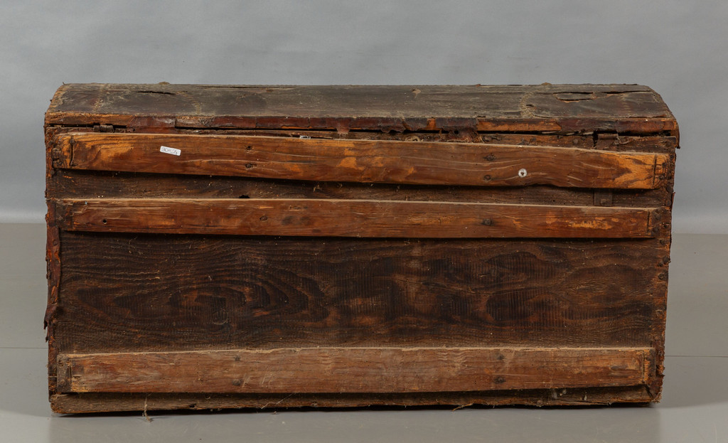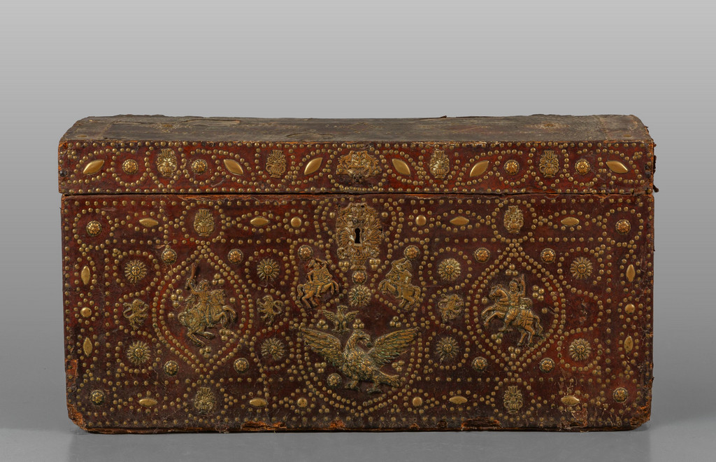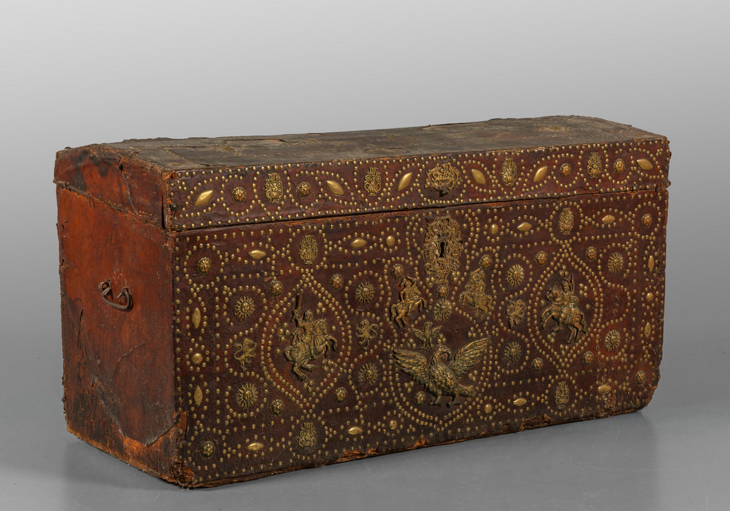 Baule in cuoio borchiato fronte decorato con motivi allegorici Spagna inizi sec.XVIII