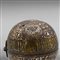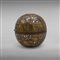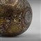 A metal bivalve sphere, decorated with brass, copper and silver wire inlays with classic motifs from the Mesopotamian and Mamluk repertoire: Y motif, cogwheels, vine leaves and large inscriptions in thuluth calligraphy. Decorative object, it has no holes for the passage of the smoke.