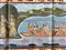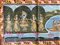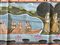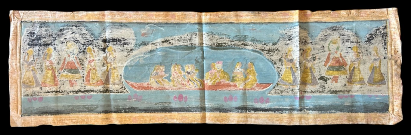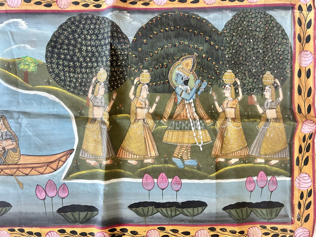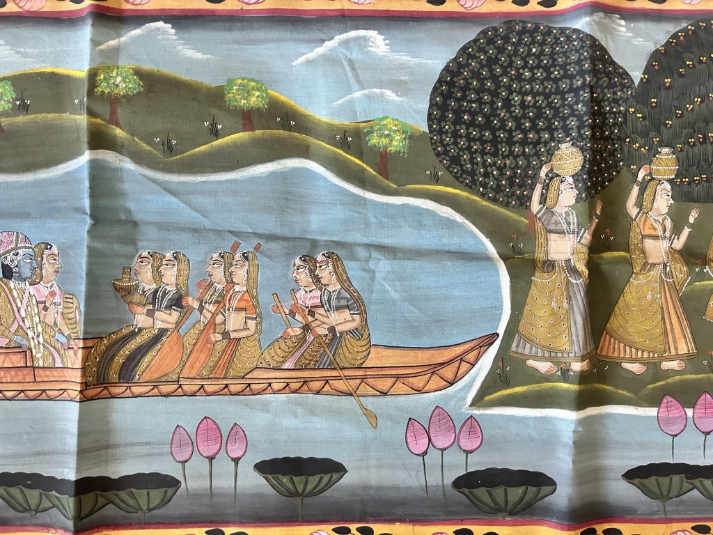 Tempera on cloth depicting Krishna and Radha in the centre, inside a boat on a lake and Krishna with water bearers on either side of the composition.