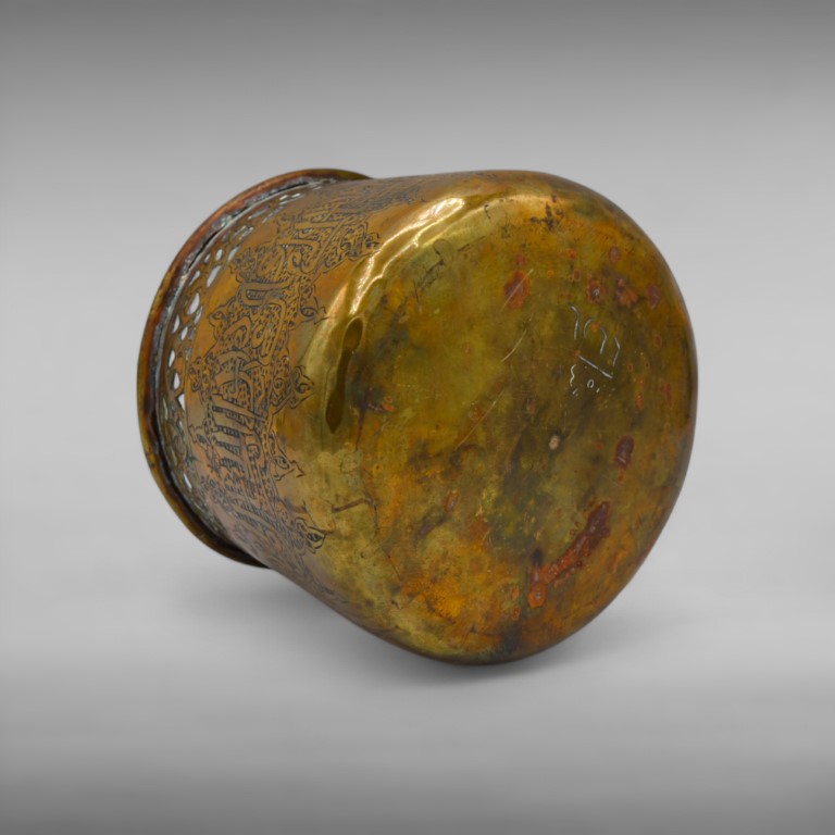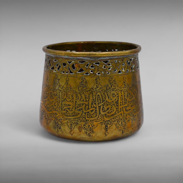 Brass, cylindrical section and straight converging walls, the exterior decorated with a large inscription in thuluth. Engraving on the base.