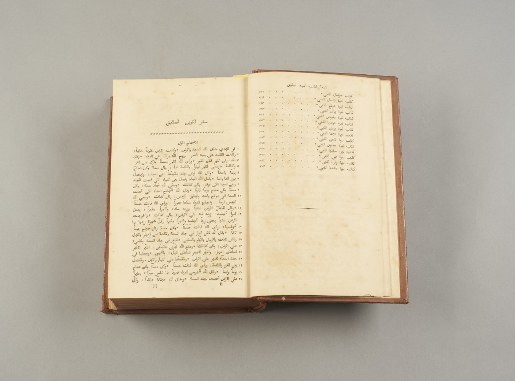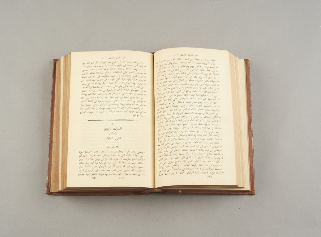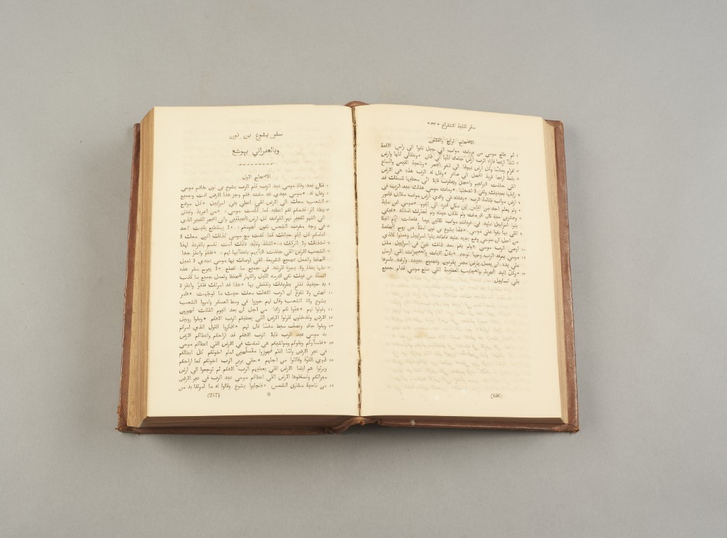 Arabic translation of the Holy Bible, Old and New Testament totalling 1404 pages, complete. Coeval leather binding, gold title to the spine.Printed after the Rome 1671 edition for the Eastern Church. One of the first modern translations into Arabic was at the initiative of the Society for Promoting Christian Knowledge. Around 1846, the Society ordered this work from the Orientalist Samuel Lee (1783-1852). The Rev. Dr. Lee invited the Lebanese scholar Ahmad Faris Shidyaq to Cambridge to participate in the translation. The translation of the Bible was published in 1857, after Samuel Lee's death, by his student and friend Professor Thomas Jarrett. This translation is still considered one of the best Arabic translations of the Bible. Bibliography: Darlow & Moulé 1684.