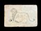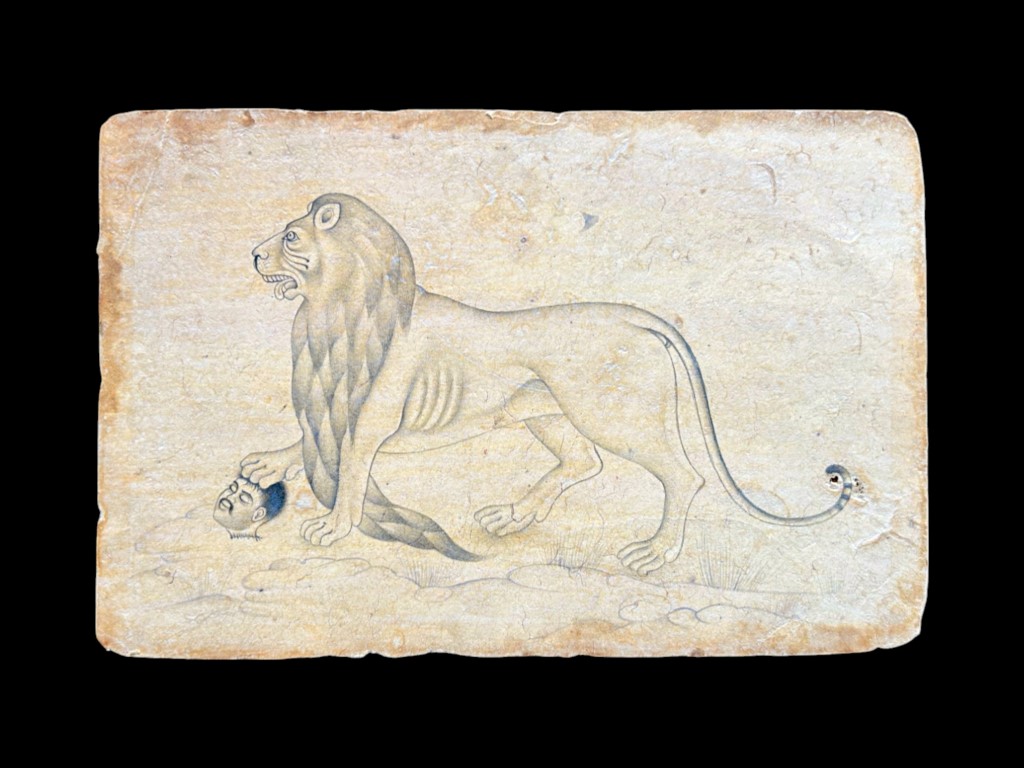 Pencil sketch on paper depicting a lion in a proud attitude above the severed head of a man.