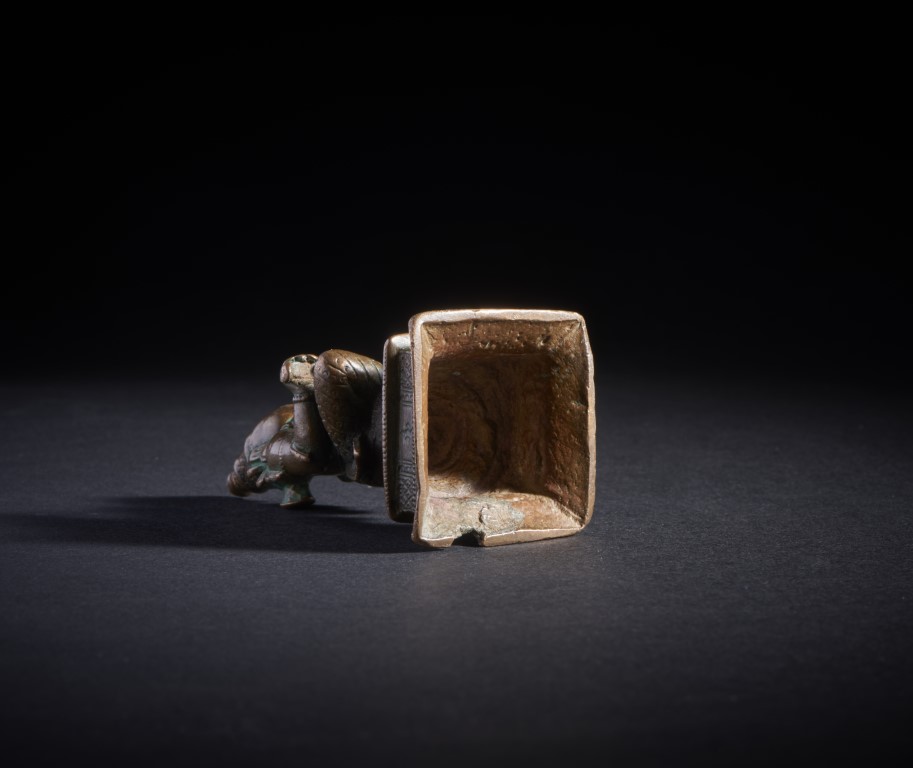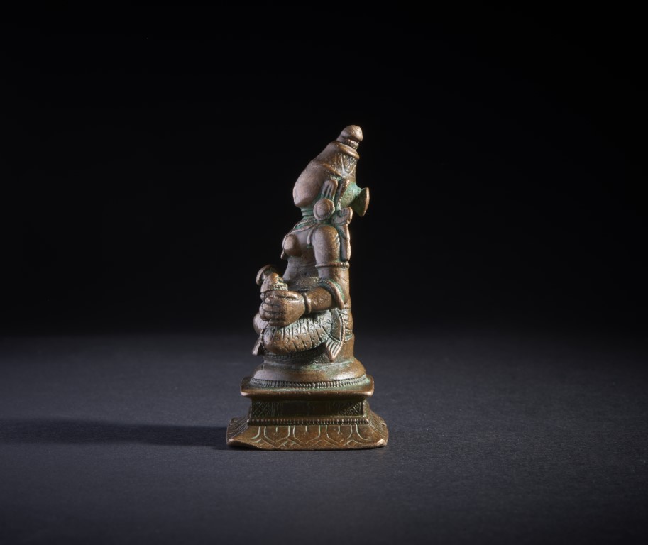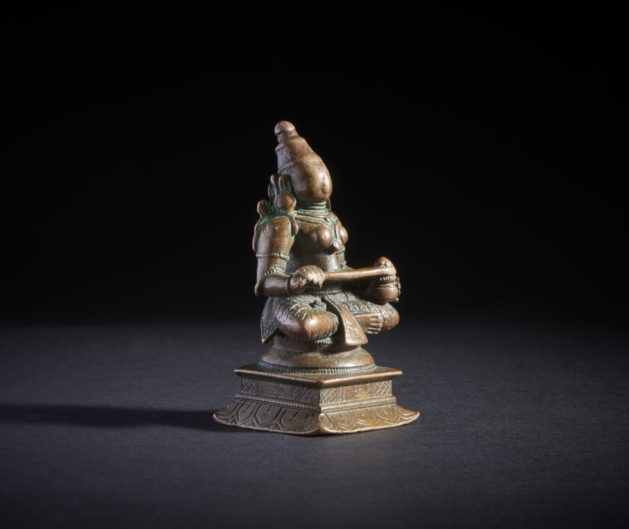 Copper alloy casting depicting one of the manifestations of Parvati, seated in half lotus position on a tiered base. With her main attribute, the spoon, she dispenses food to the needy.