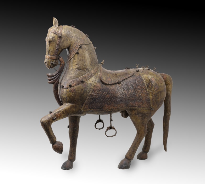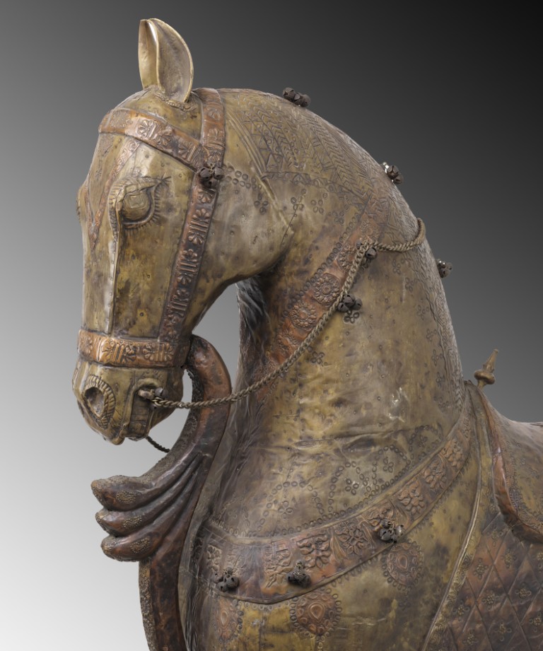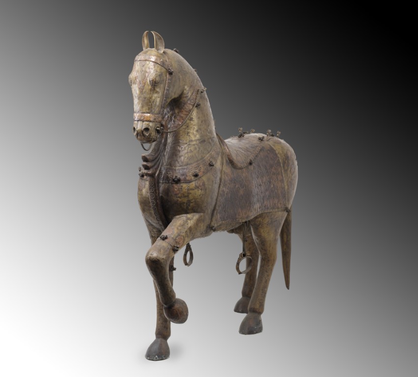 A massive wooden horse coated with an embossed metal sheet engraved in a lifelike style to evoke the mane and the harnesses decorated with minute floral motifs and small multiple bells.