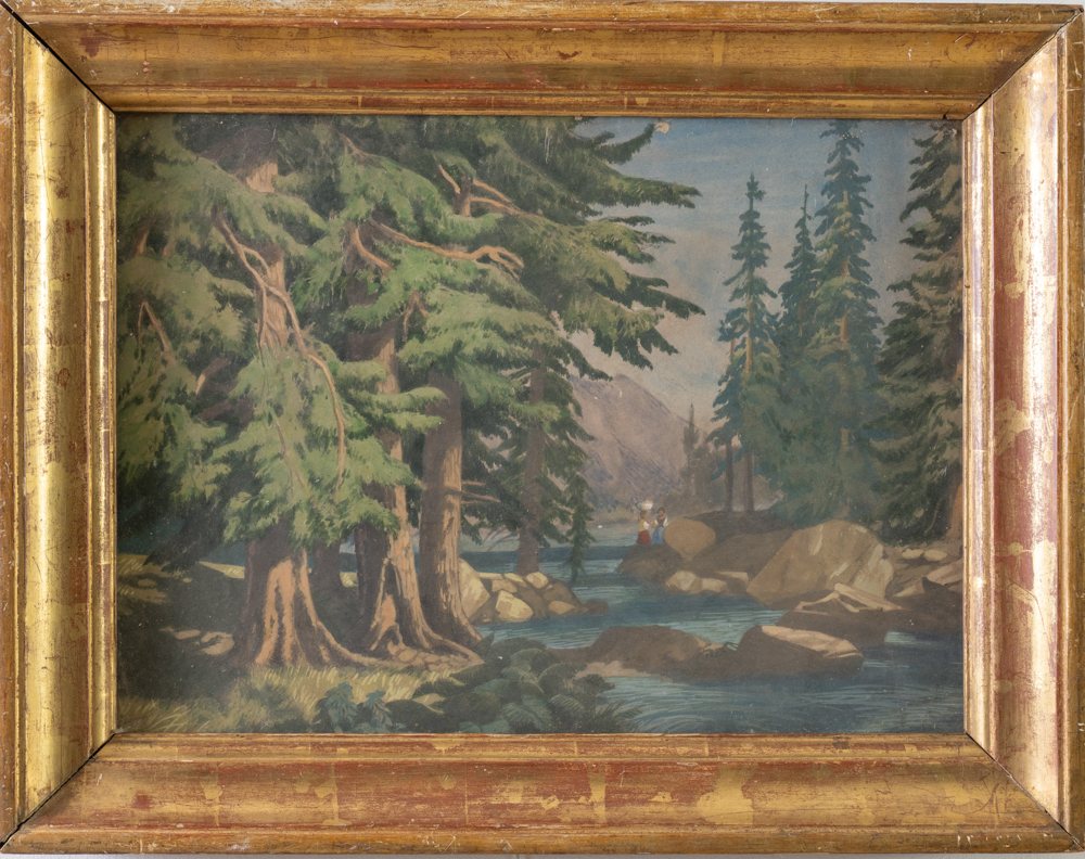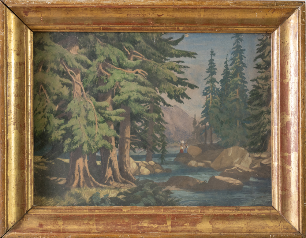 Pittore del XIX-XX secolo. Scorcio boschivo con due figure. Acquarello su carta. Cm. 29x39. Con cornice cm. 35,5x45.