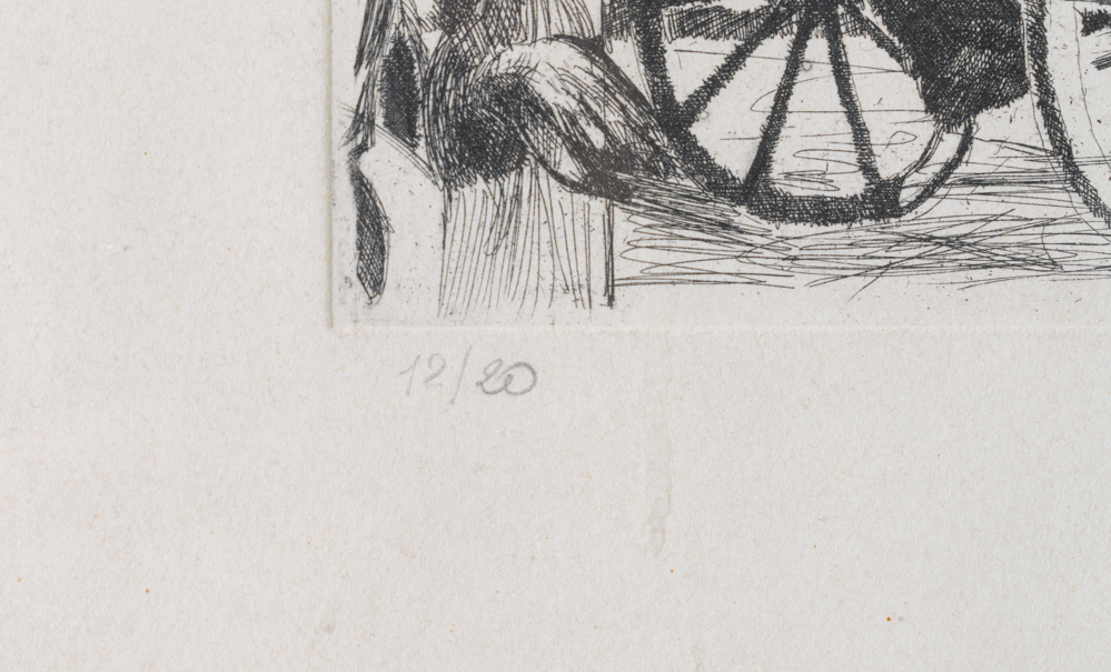 Artista del XX secolo. Carrozza con cavallo e figure. Acquaforte su carta. Firmata a matita in basso a destra. Numerata a natita in basso sinistra. Esemplare n. 12/20. Presenta macchie sulla carta. Cm. lastra 14,5x24,5. Con cornice 35,5x45.