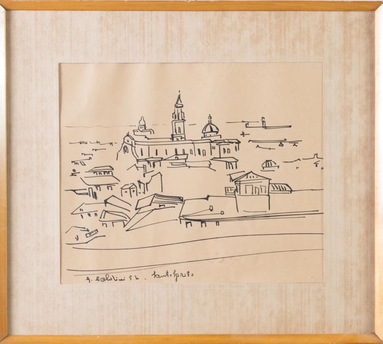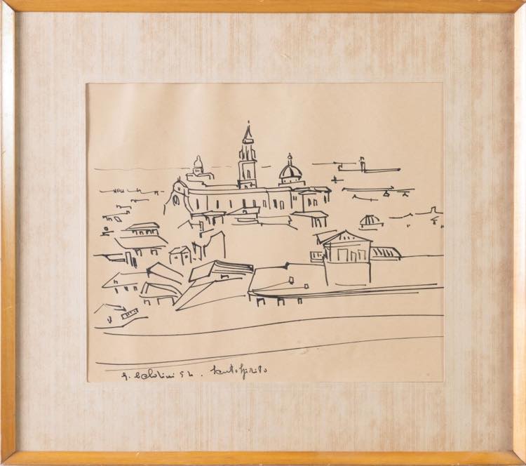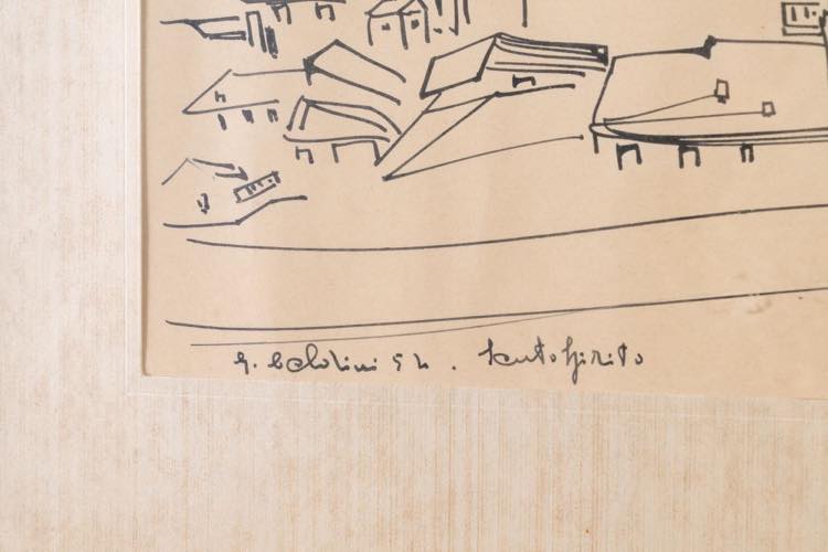 Pittore della metà del XX secolo. Santo Spirito, 1954. China su carta. Firmato, titolato e datato in basso a sinistra. Con cornice e vetro. Cm. 36x31. In cornice cm. 41x46.