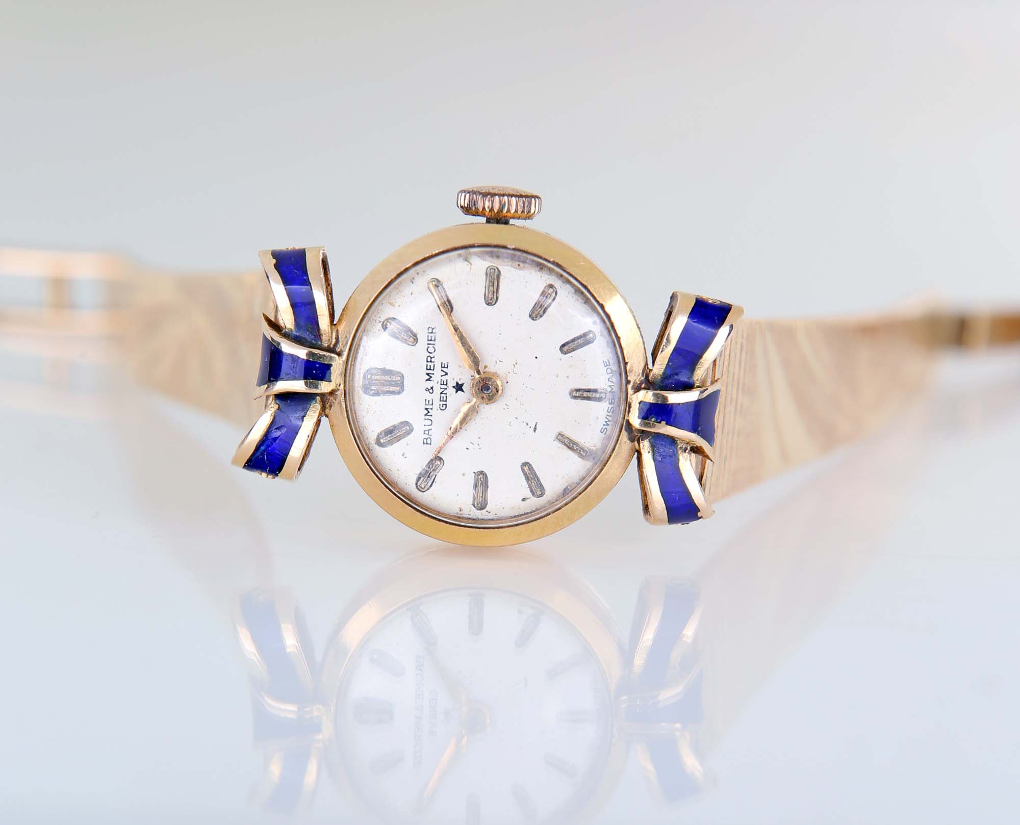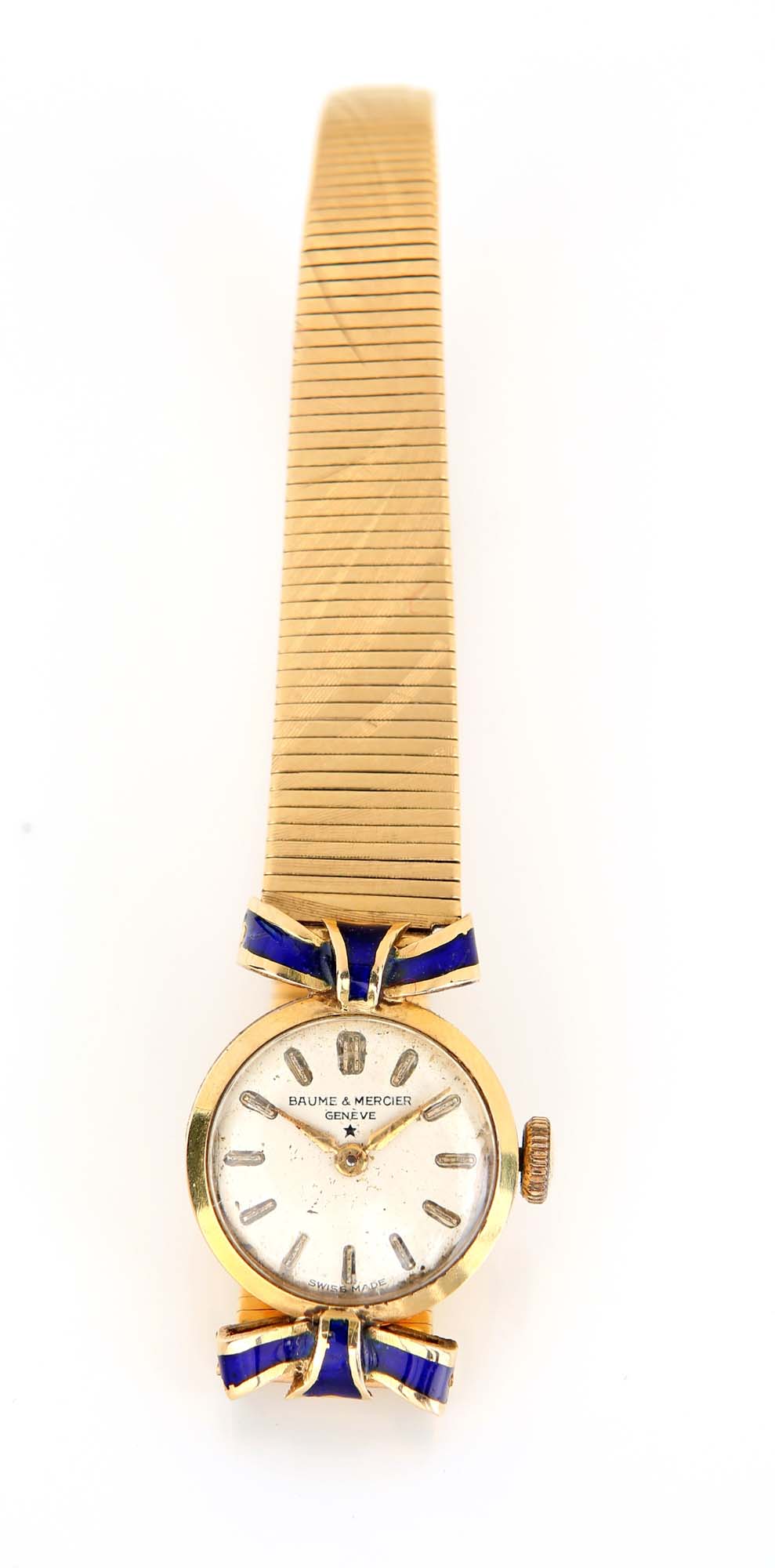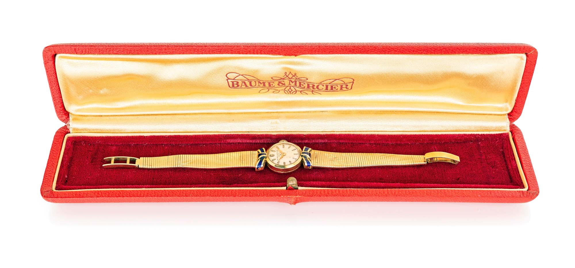 Baume & Mercier orologio da polso in oro. Oro giallo 750/000. Cassa n° 13245, bracciale incorporato in oro 750/000 e decorato a smalto blu, fondello a scatto. Quadrante argentato con indici applicati. Movimento manuale, bilanciere monometallico con viti, spirale piana. Accessori: astuccio Baume & Mercier Peso complessivo gr. 21,80 Lunghezza cm 16,5, diametro cassa mm 18. Anni '50