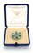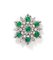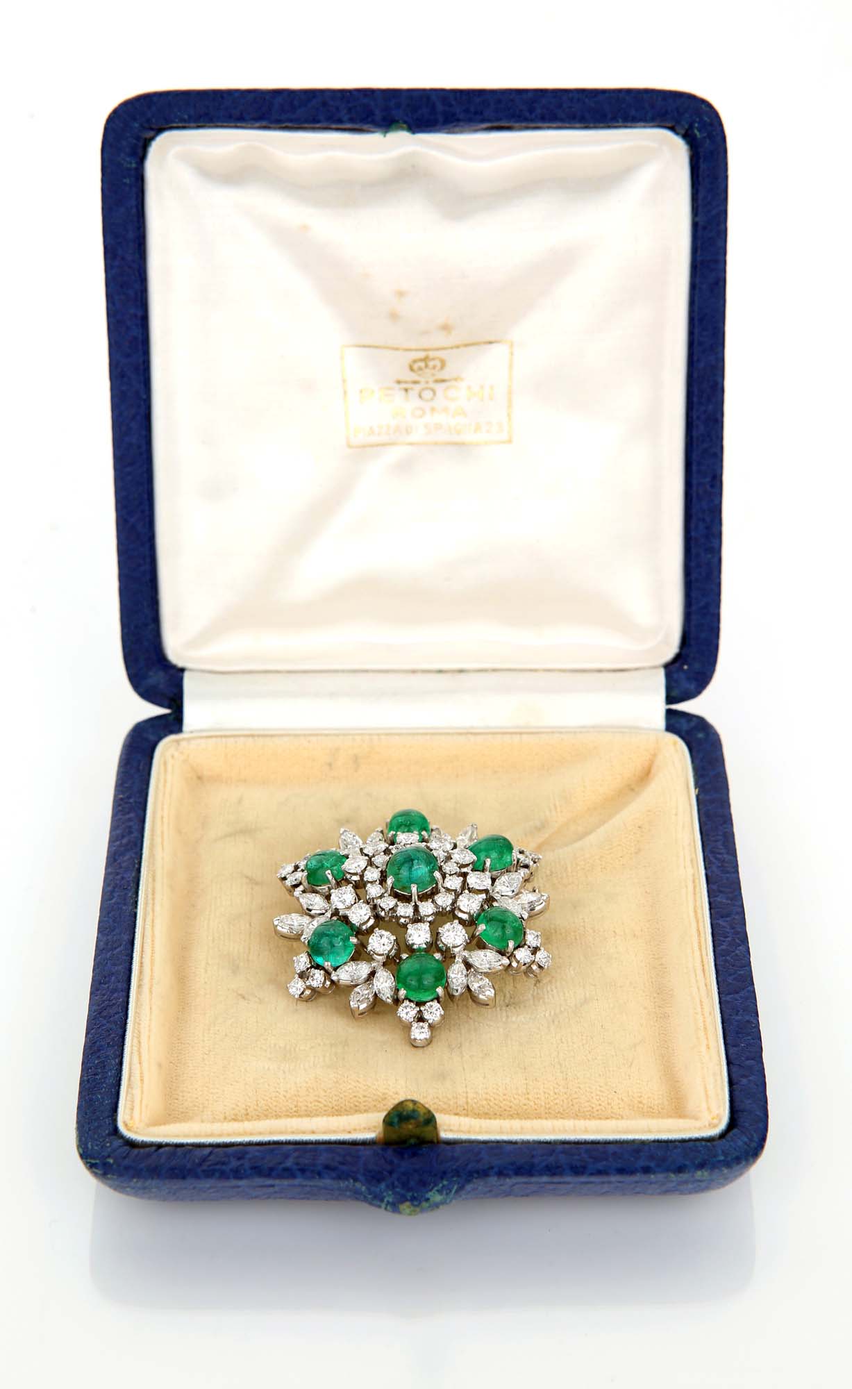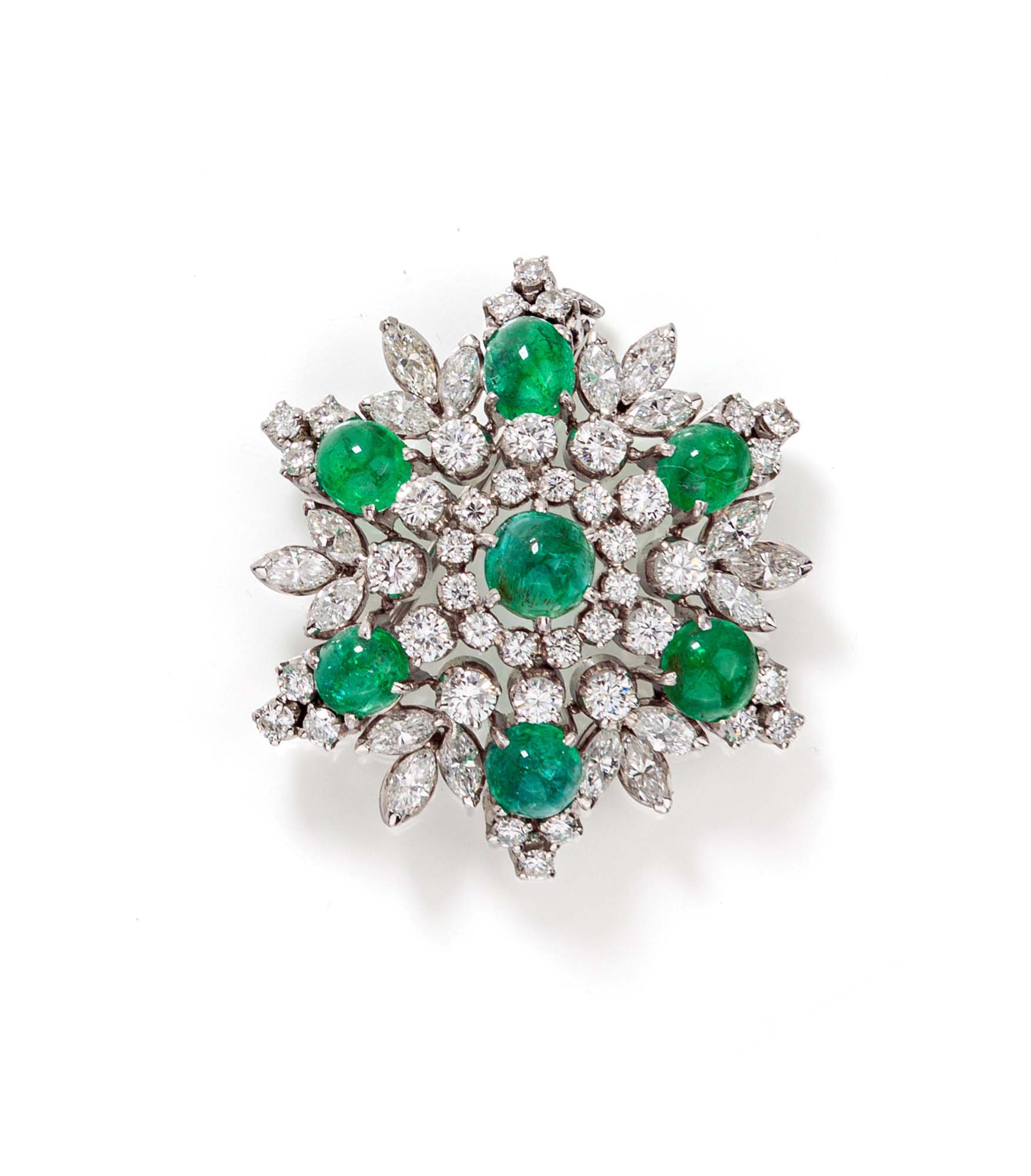 Petochi, spilla in oro, smeraldi e brillanti Oro bianco 750/000. Diamanti in taglio rotondo brillante e taglio navette ct. 2,50 ca., smeraldi in taglio cabochon ct. 5 ca. Peso gr. 17,50. Corredato di custodia originale Diametro cm 4.
