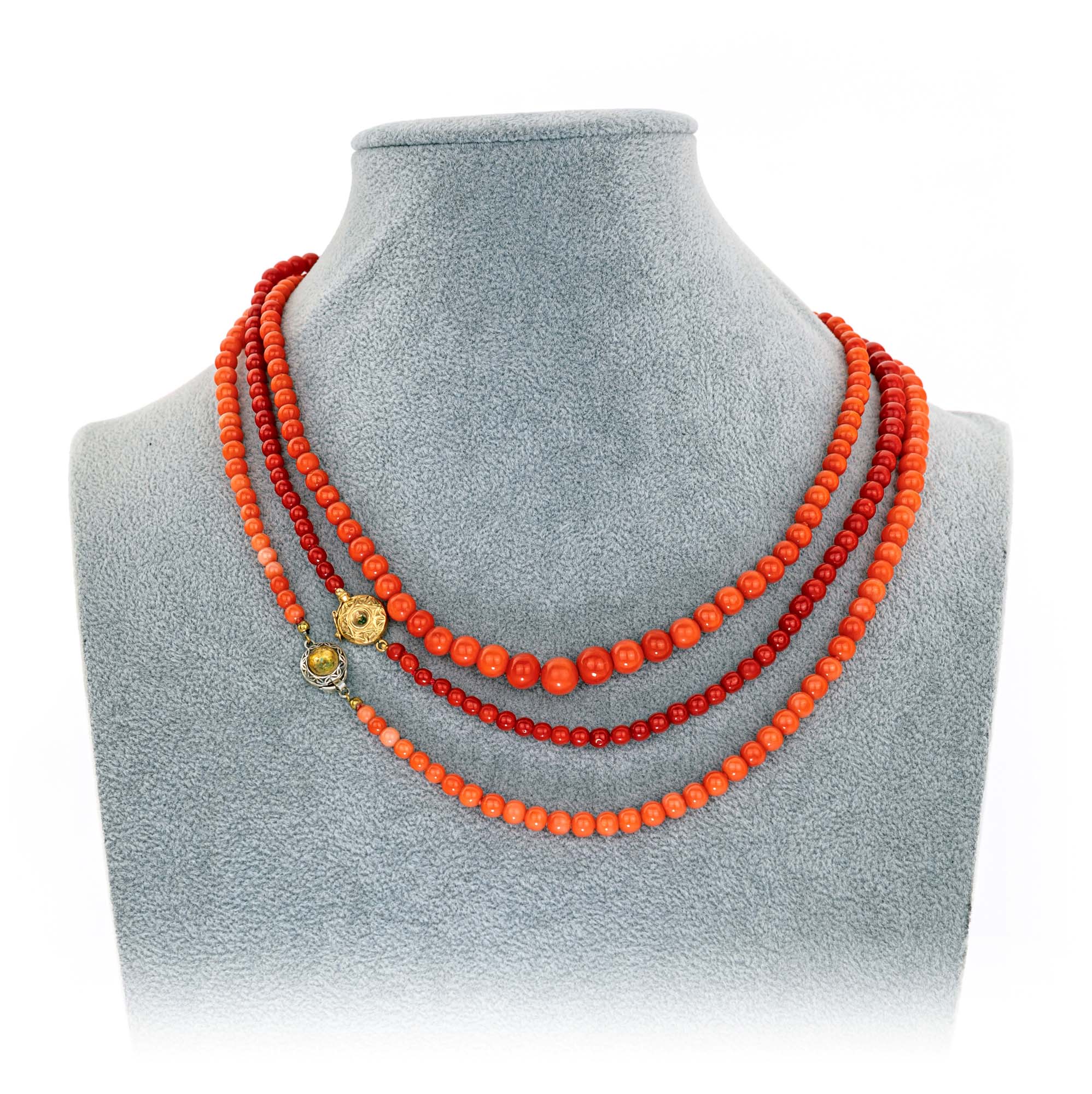 Gruppo di 3 collane ad un filo in corallo, oro e argento