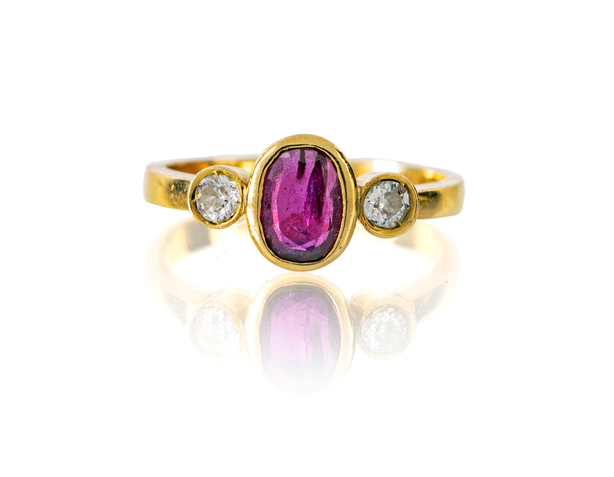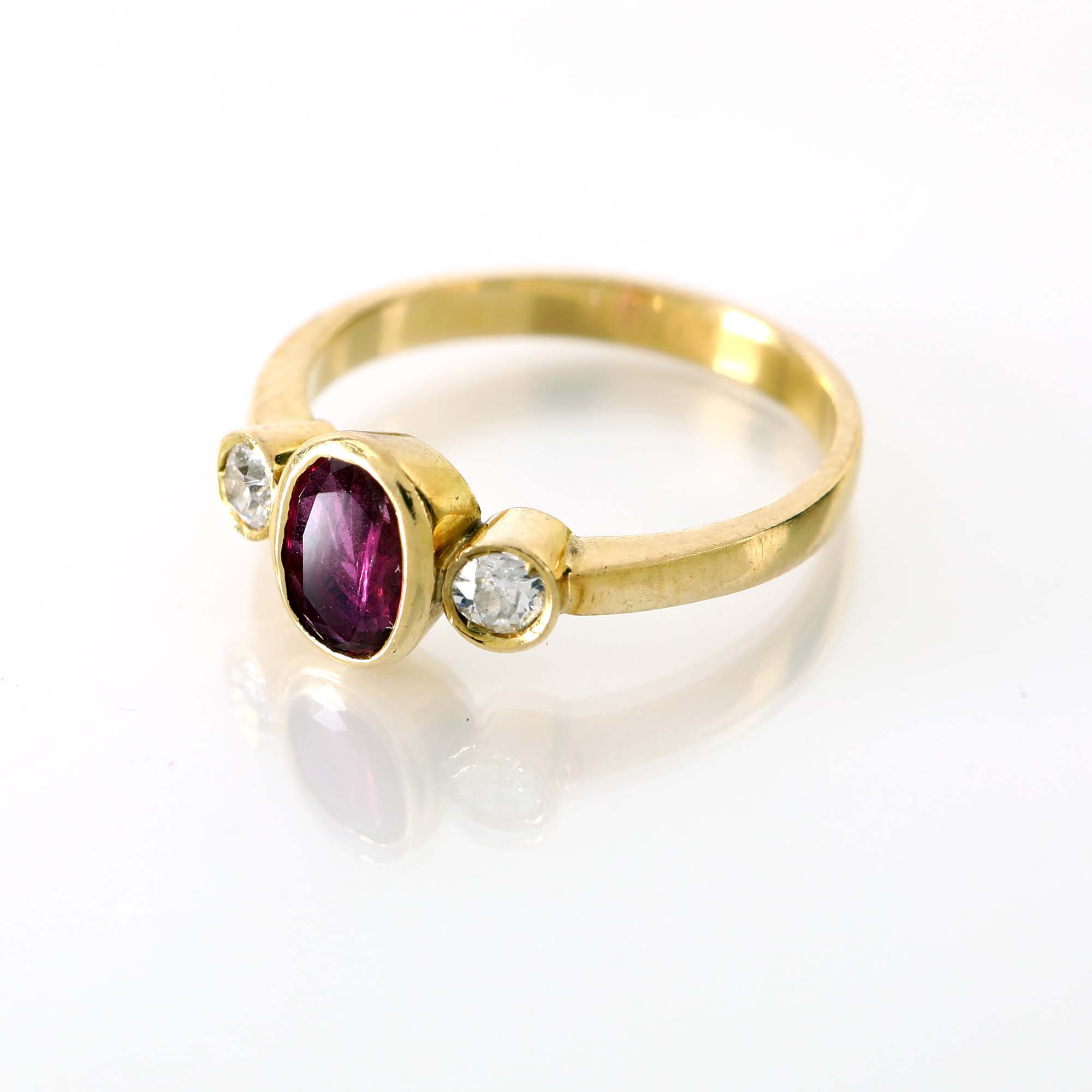 Anello in oro, brillanti e rubini Oro giallo 750/000. Rubino naturale in taglio ovale, diamanti in taglio rotondo brillante. Peso complessivo gr. 3,40 Misura 14