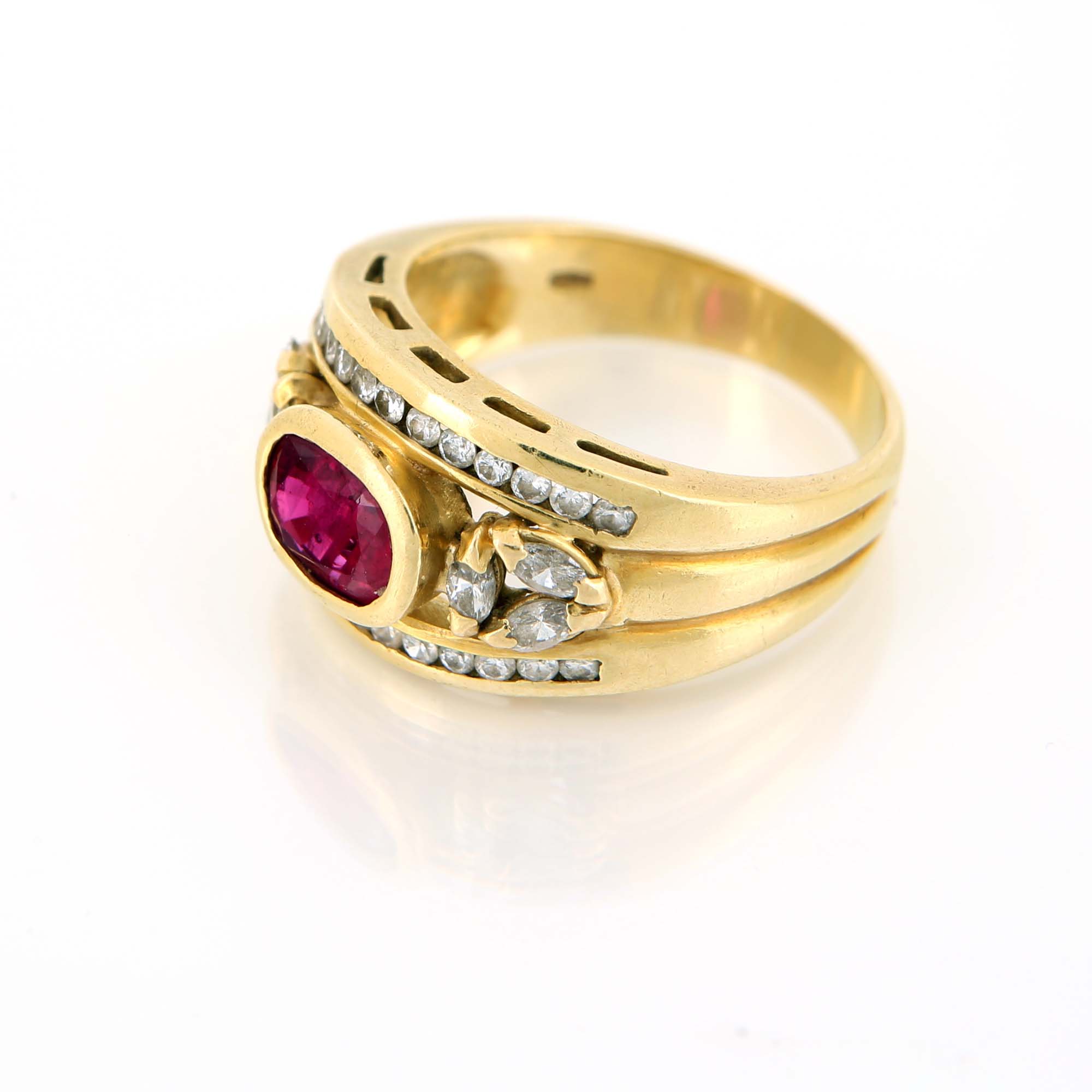 Anello a fascia in oro, rubino e brillanti Oro giallo 750/000. Rubino in taglio ovale ct 1,60 e diamanti in taglio rotondo brillante ct 0,75. Peso complessivo gr. 8,60. Corredato di certificazione gemmologica IGN n° 36249 del 23/10/2024. Misura 18