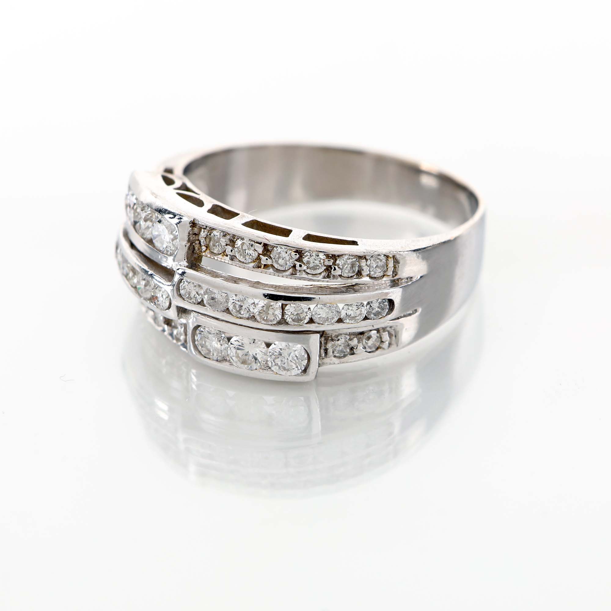 Anello a fascia in oro e brillanti Oro bianco 750/000. Diamanti in taglio rotondo brillante ct. 0,80 ca. Peso complessivo gr. 6,80 Misura 20
