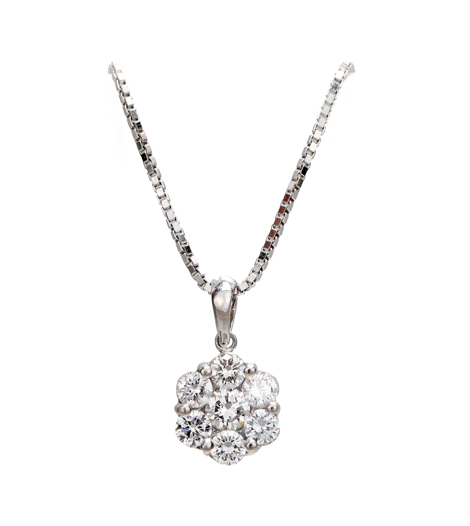 Pendente a fiore in oro e brillanti Oro bianco 750/000. Diamanti in taglio rotondo brillante ct. 1 ca. Peso complessivo 1,30 Diametro cm 1. Lunghezza cm 42