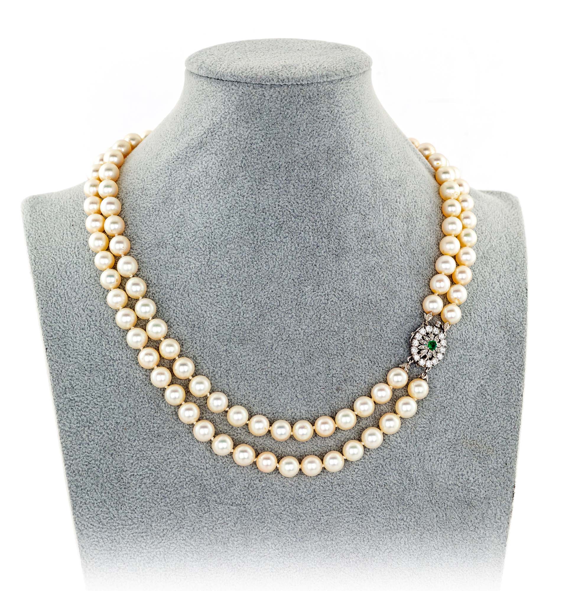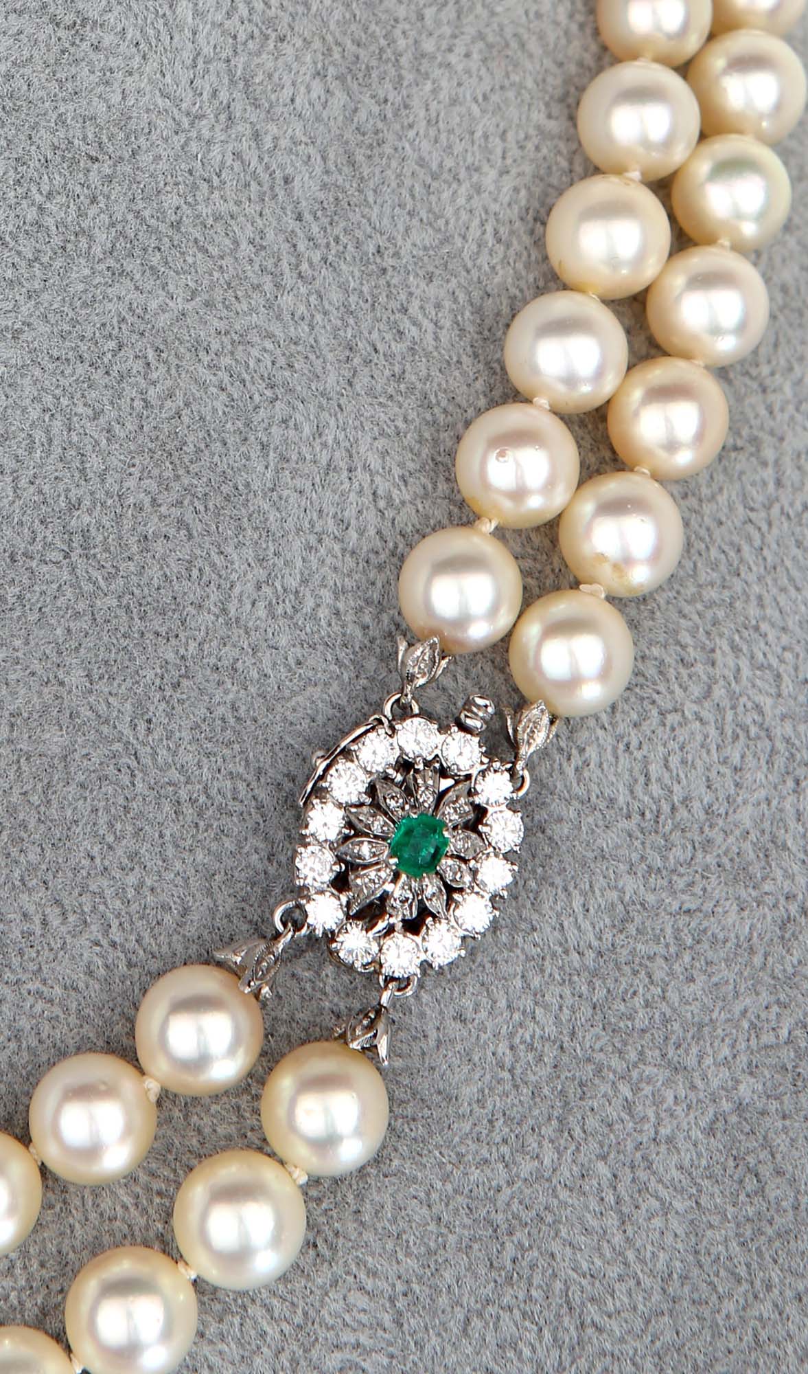 Lot 214 | Collana di perle coltivate, oro brillanti e smeraldo Oro bianco 750/000....