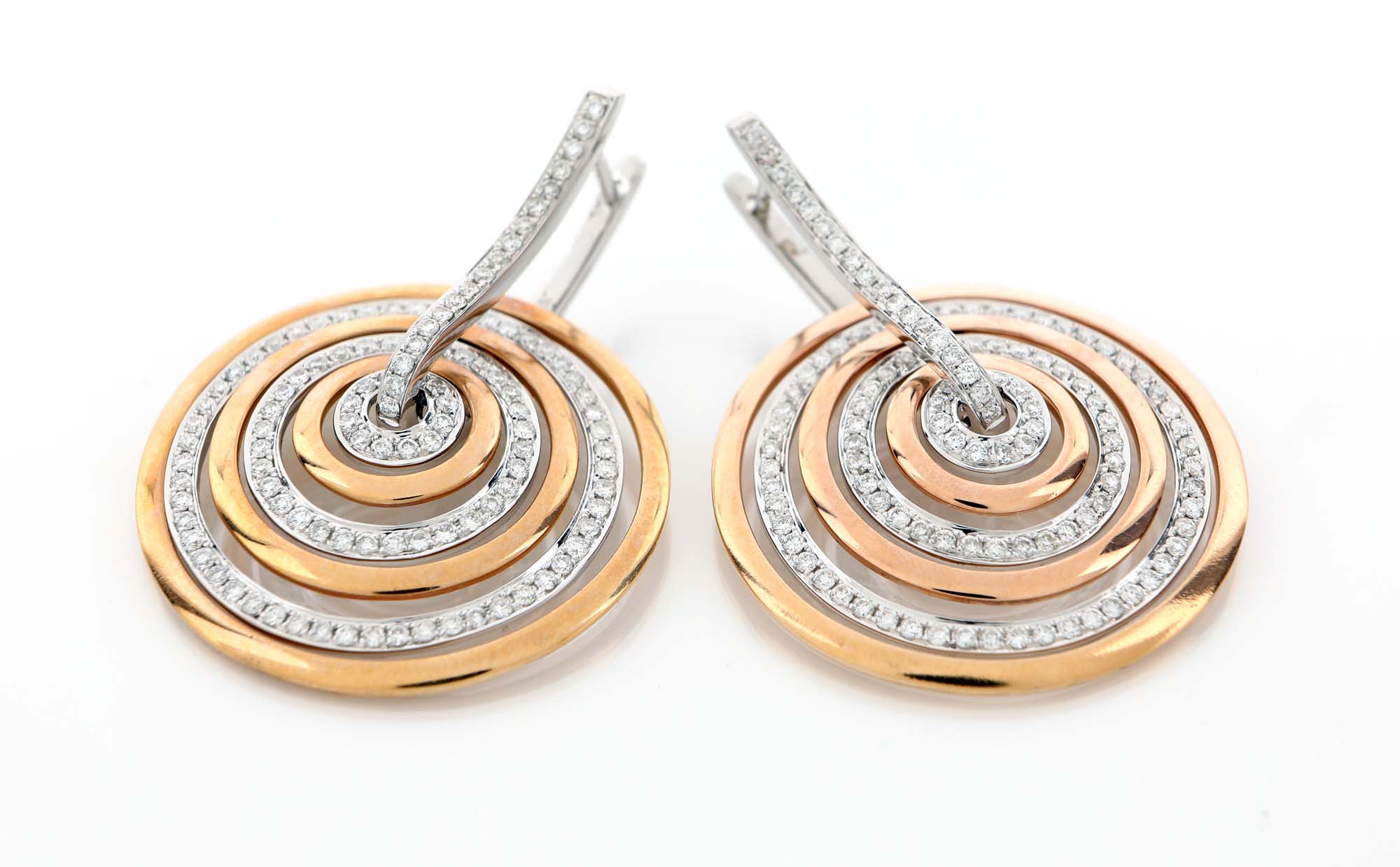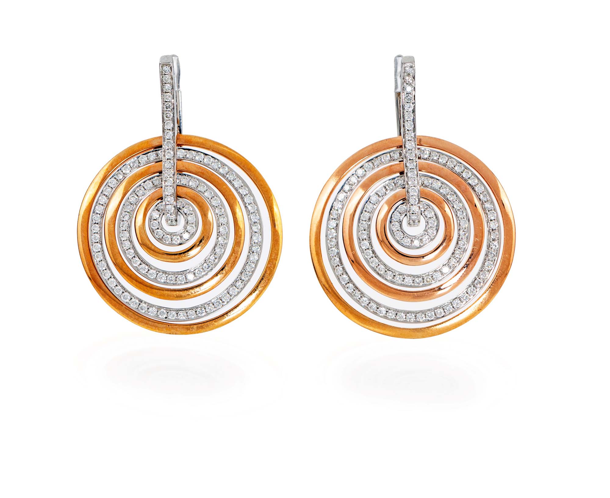 Coppia di orecchini pendente a cerchi concentrici in oro e brillanti Oro bianco e rosa 750/000. Diamanti in taglio rotondo brillante ct. 2,20 ca., prob F-G, VVS-VS. Peso complessivo gr. 18,60 Lunghezza cm 4,5, diametro del cerchi cm 3