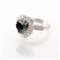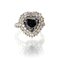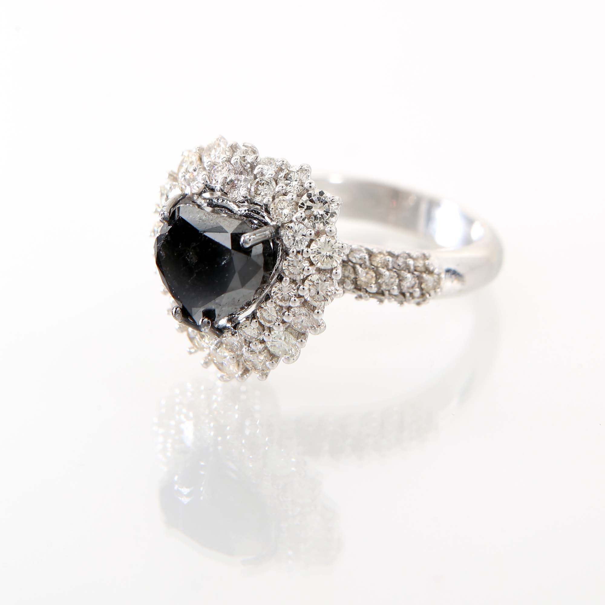 Anello classico in oro, brillanti e brillante nero Oro bianco 750/000. Diamante centrale fancy in taglio cuore ct. 3,40, diamanti in taglio rotondo brillante ct. 1,80. F- VS. Peso complessivo gr. 8. Misura 13