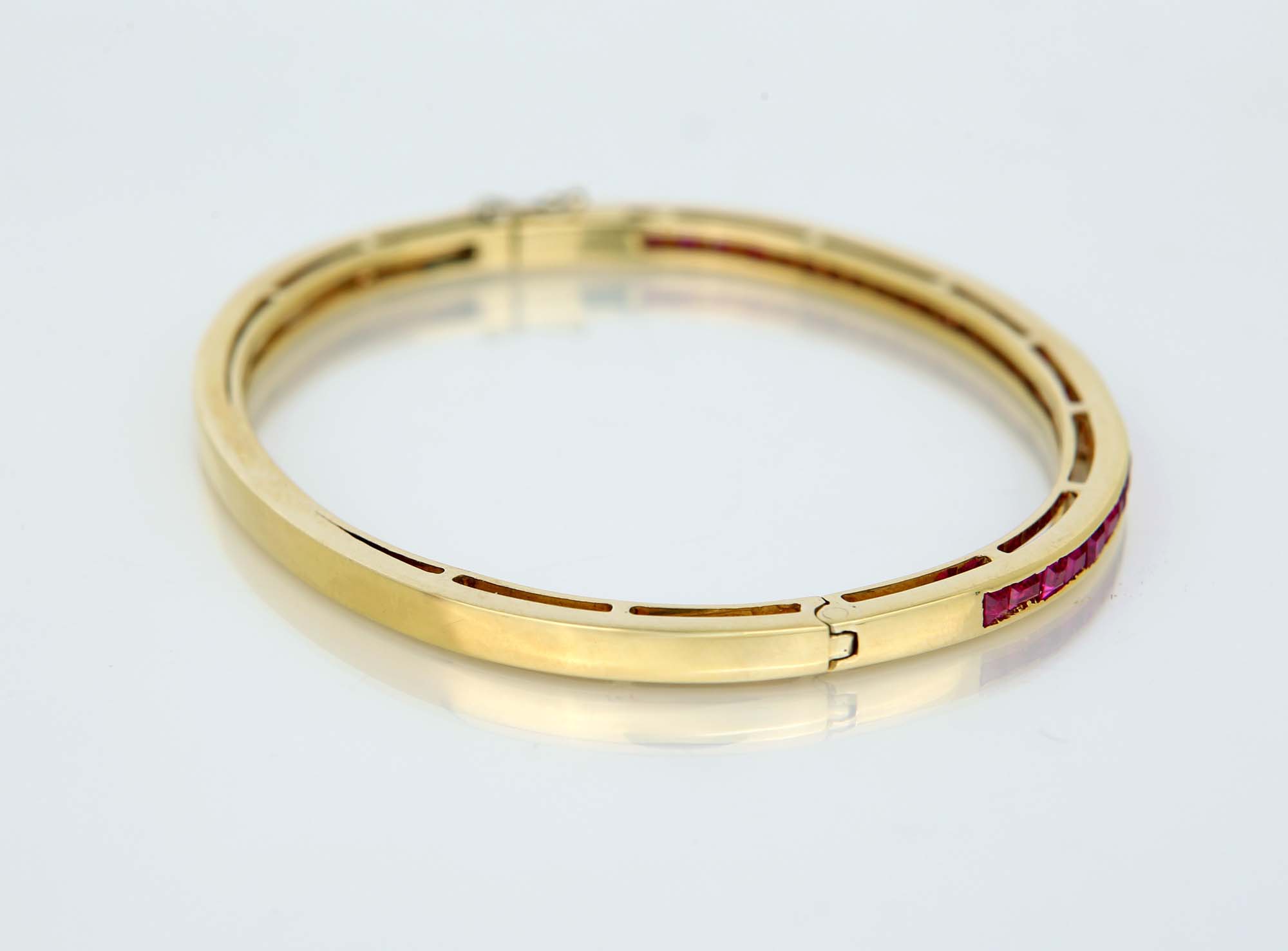 Bracciale a manetta in oro e rubini Oro giallo 750/000. Rubini in taglio carrè ct. 2 ca. Peso complessivo gr. 18,70 Veste polso cm 18