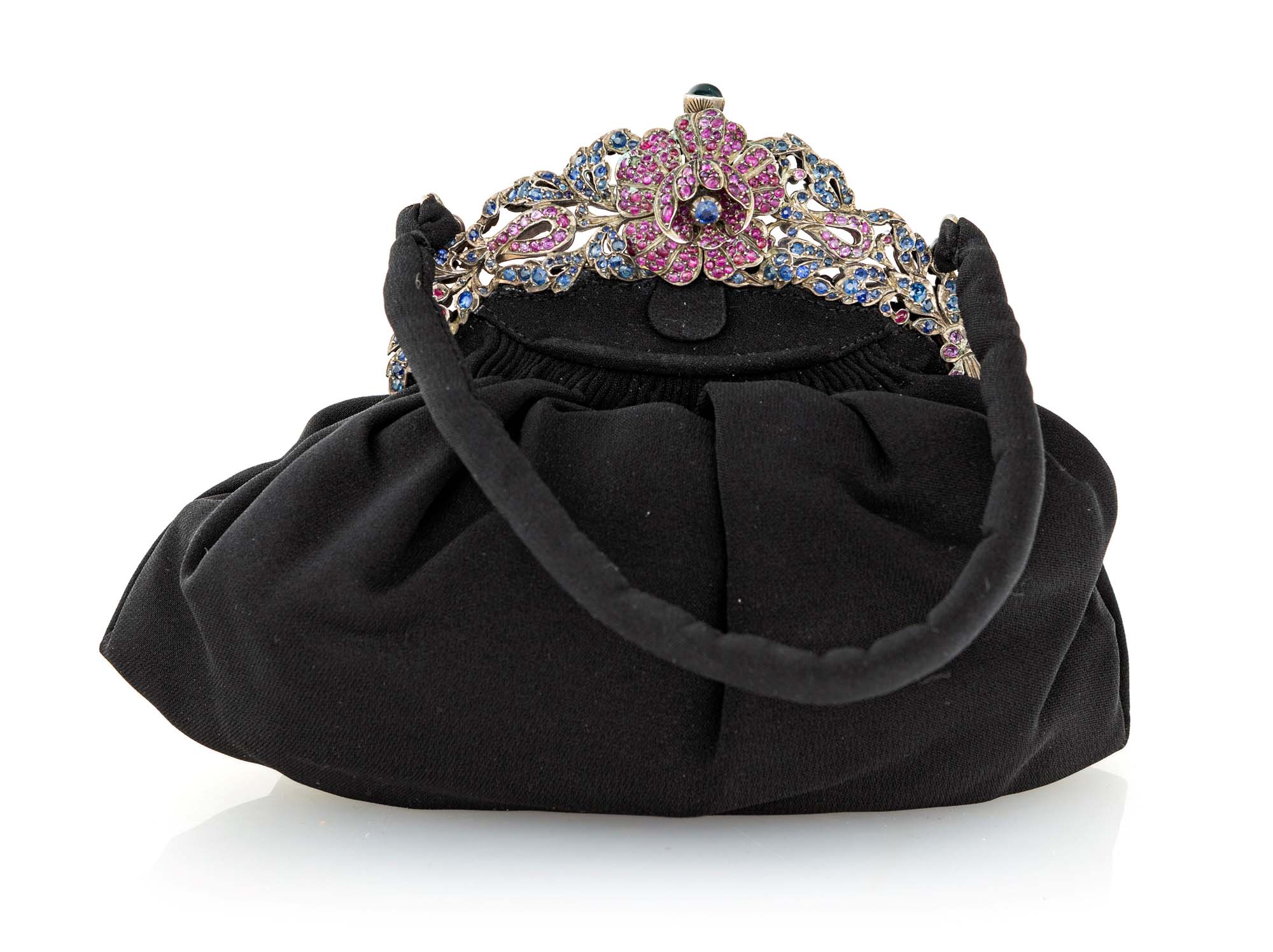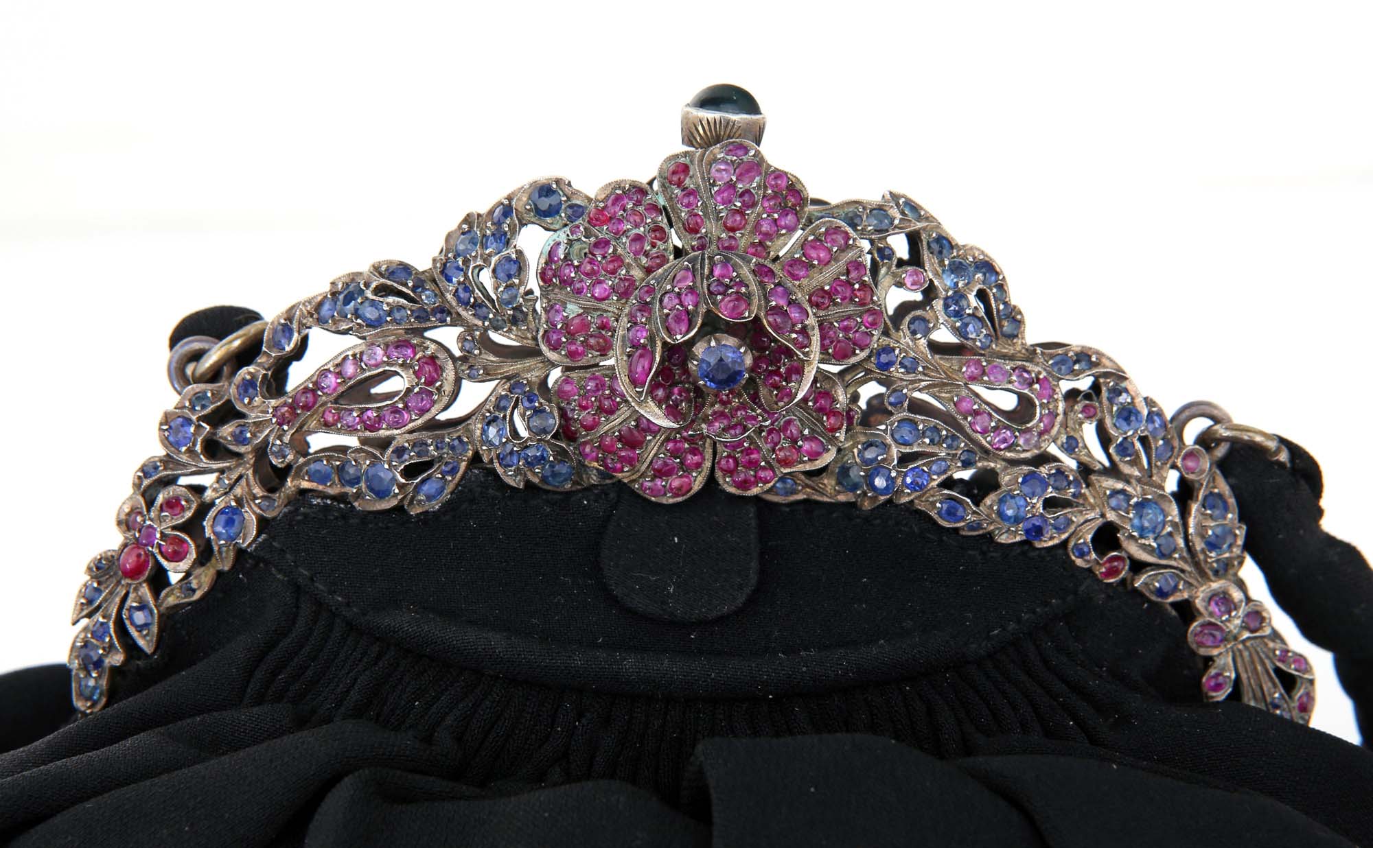 Pochette da sera liberty in seta, argento, zaffiri e rubini Argento 925/000. Zaffiri e rubini in taglio ovale e cabochon ct. 25 ca. cm 22 x cm 19