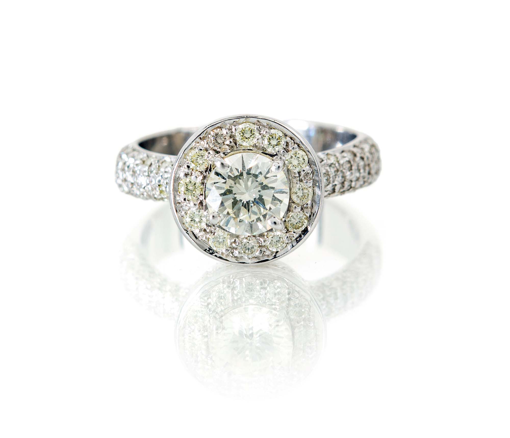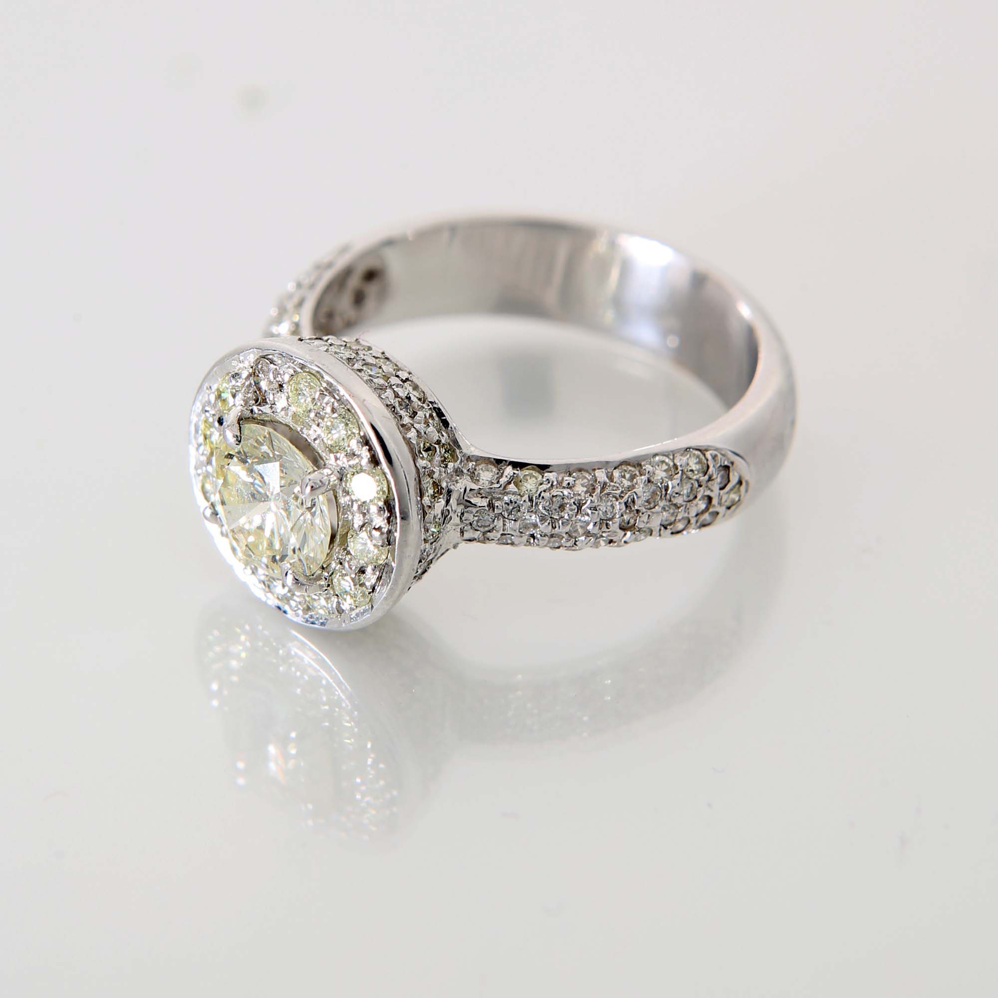 Anello in oro, brillante solitario centrale e brillanti Oro bianco 750/000. Diamante centrale ct. 0,90 ca, diamanti in taglio rotondo brillante ct. 1,10. Peso complessivo gr. 6 Misura 13