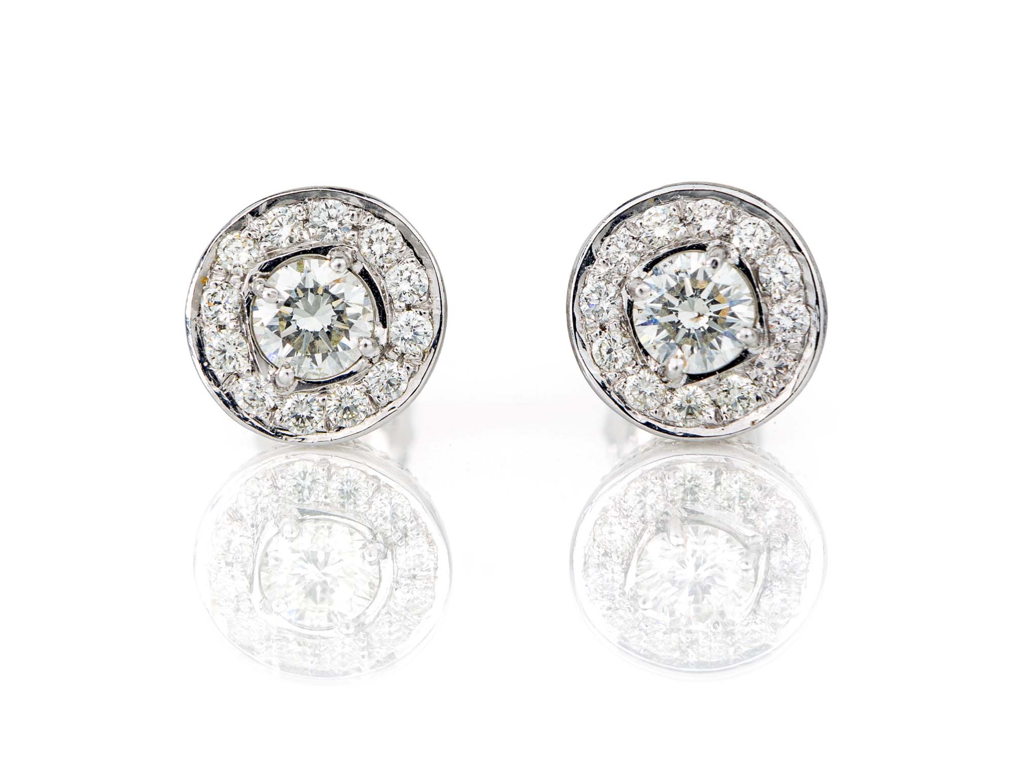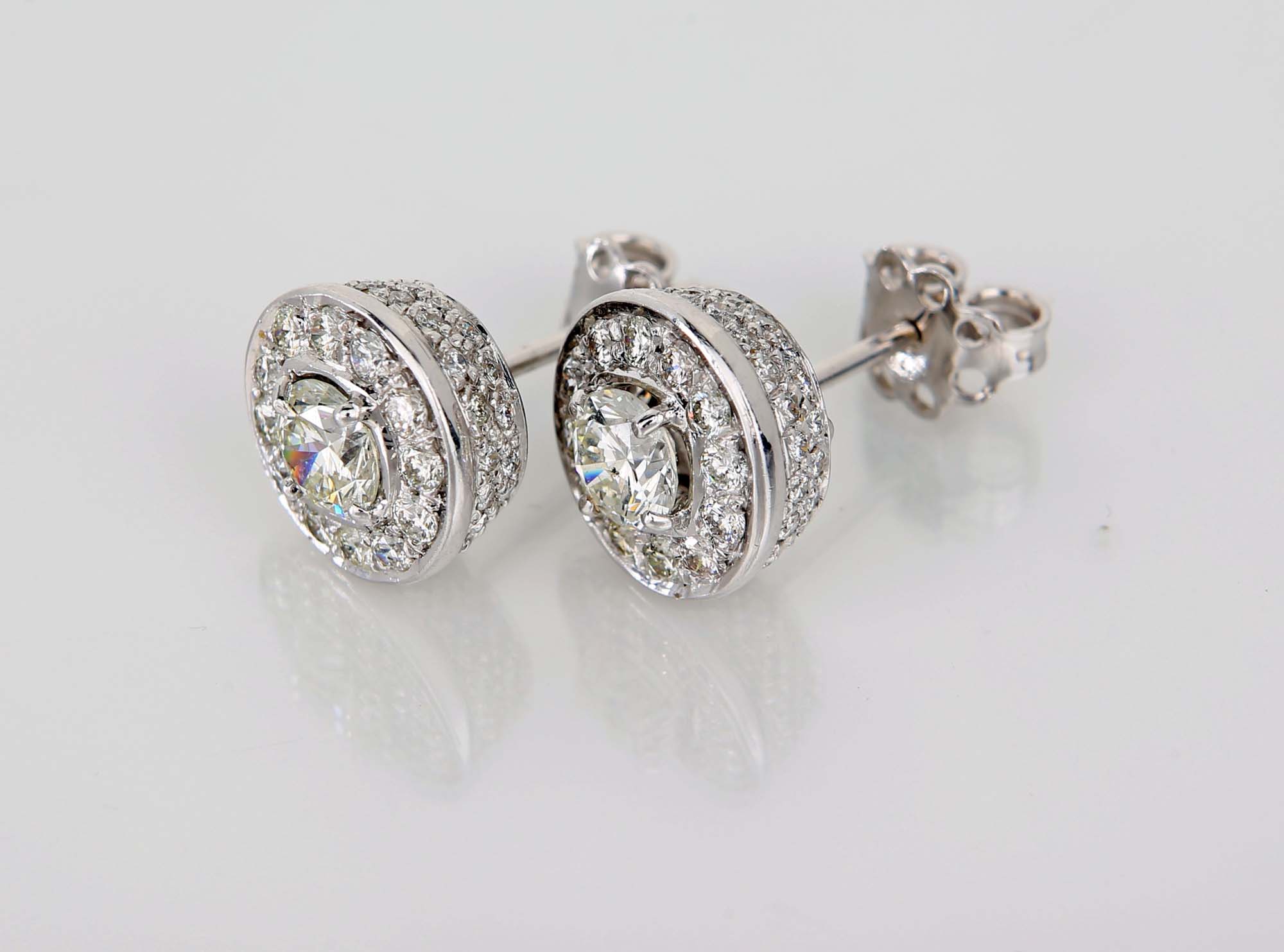 Coppia di orecchini in oro, brillante solitario centrale e brillanti Oro bianco 750/000. Diamanti in taglio rotondo brillanti ct. 2,10. G-H, VS. Peso complessivo gr. 5,50. Diametro mm. 12