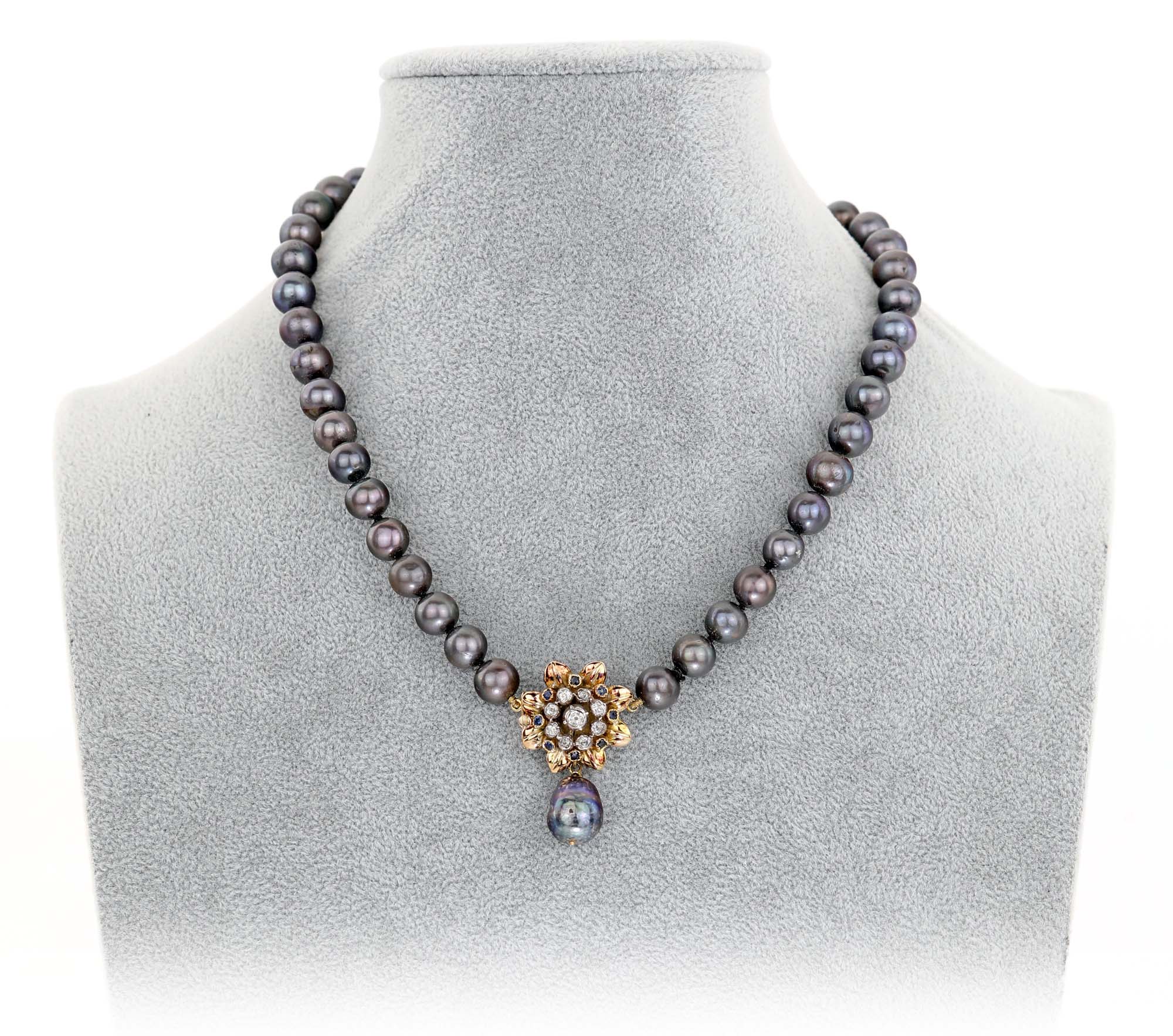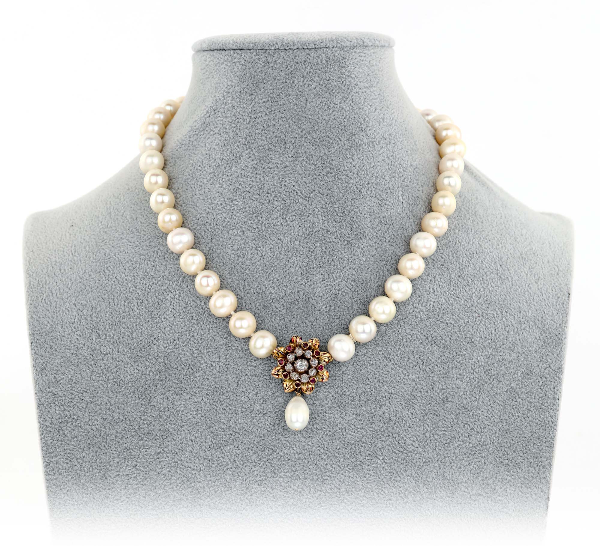 Coppia di collane in perle coltivate d'acqua dolce bianche e nere con chiusure in oro, diamanti, rubini e zaffiri