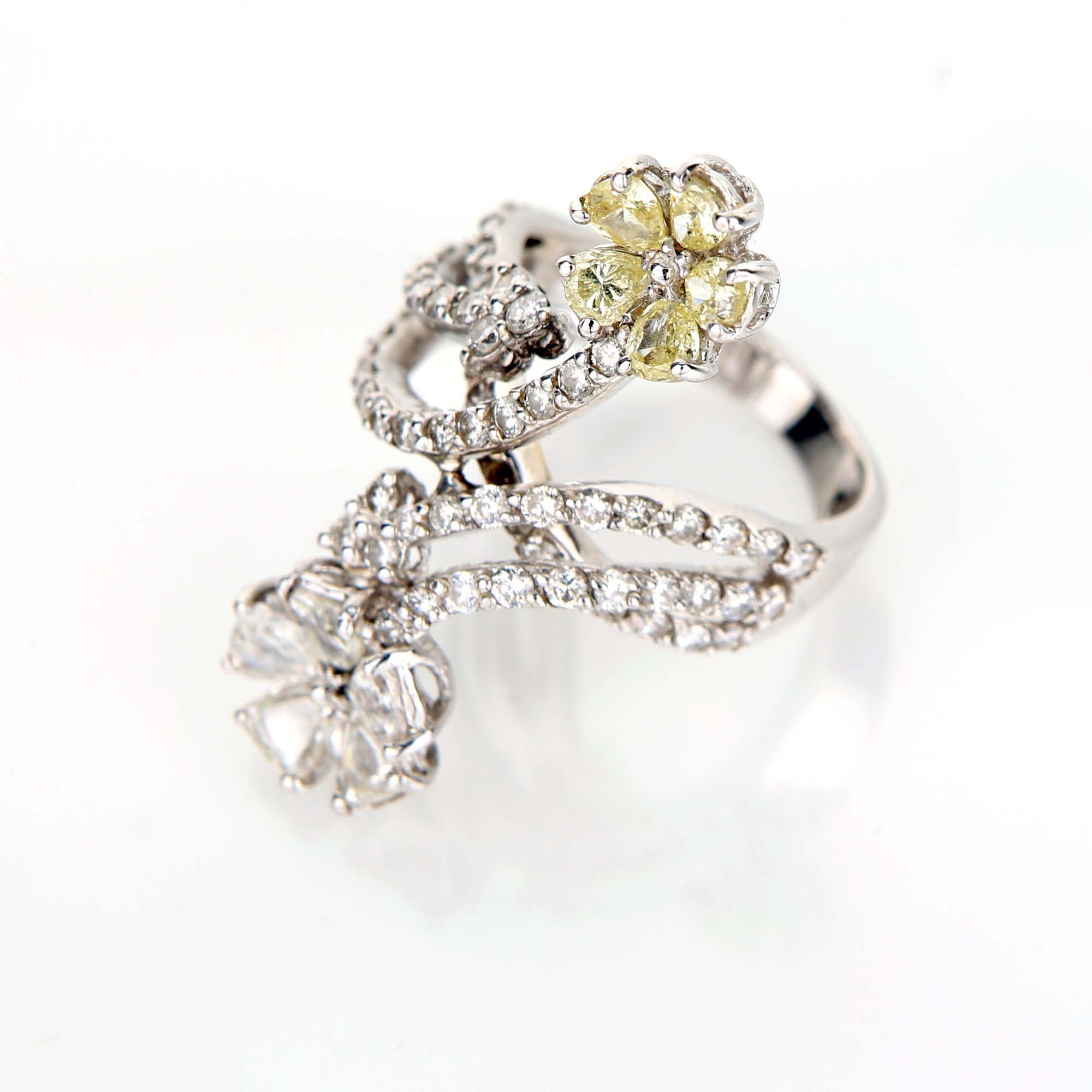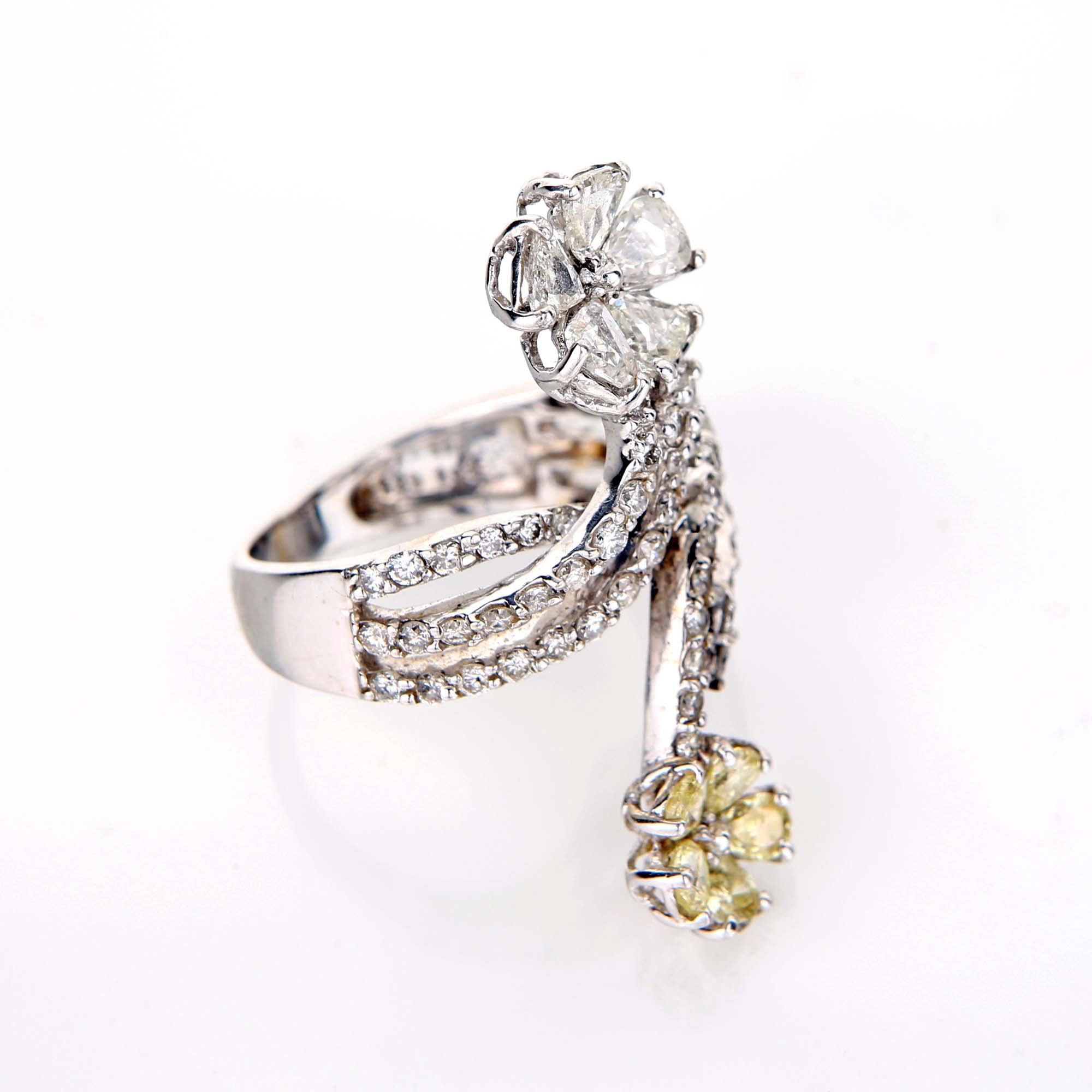 Oro bianco 750/000, diamanti in taglio rotondo brillante ct. 1,23, diamanti fancy yellow in taglio goccia ct. 1,02 e diamanti in taglio goccia antico ct. 1,3. Peso complessivo gr. 6,80.