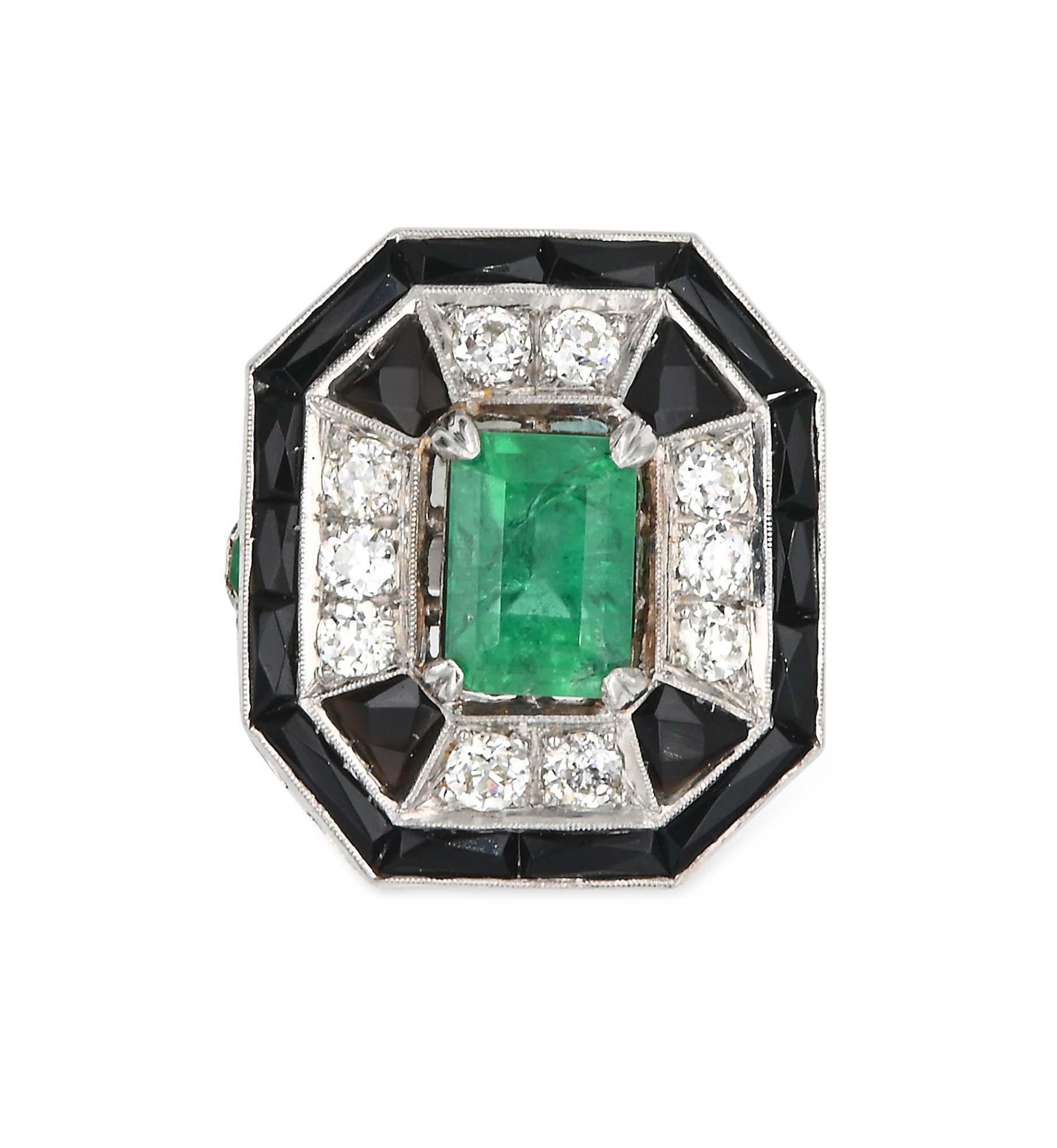 Anello in platino, smeraldi onice e brillanti Platino 950/000. Smeraldo in taglio smeraldo ct. 2,50 ca. Diamanti in taglio rotondo ct. 1,50. Peso complessivo gr. 12,30 Misura 15