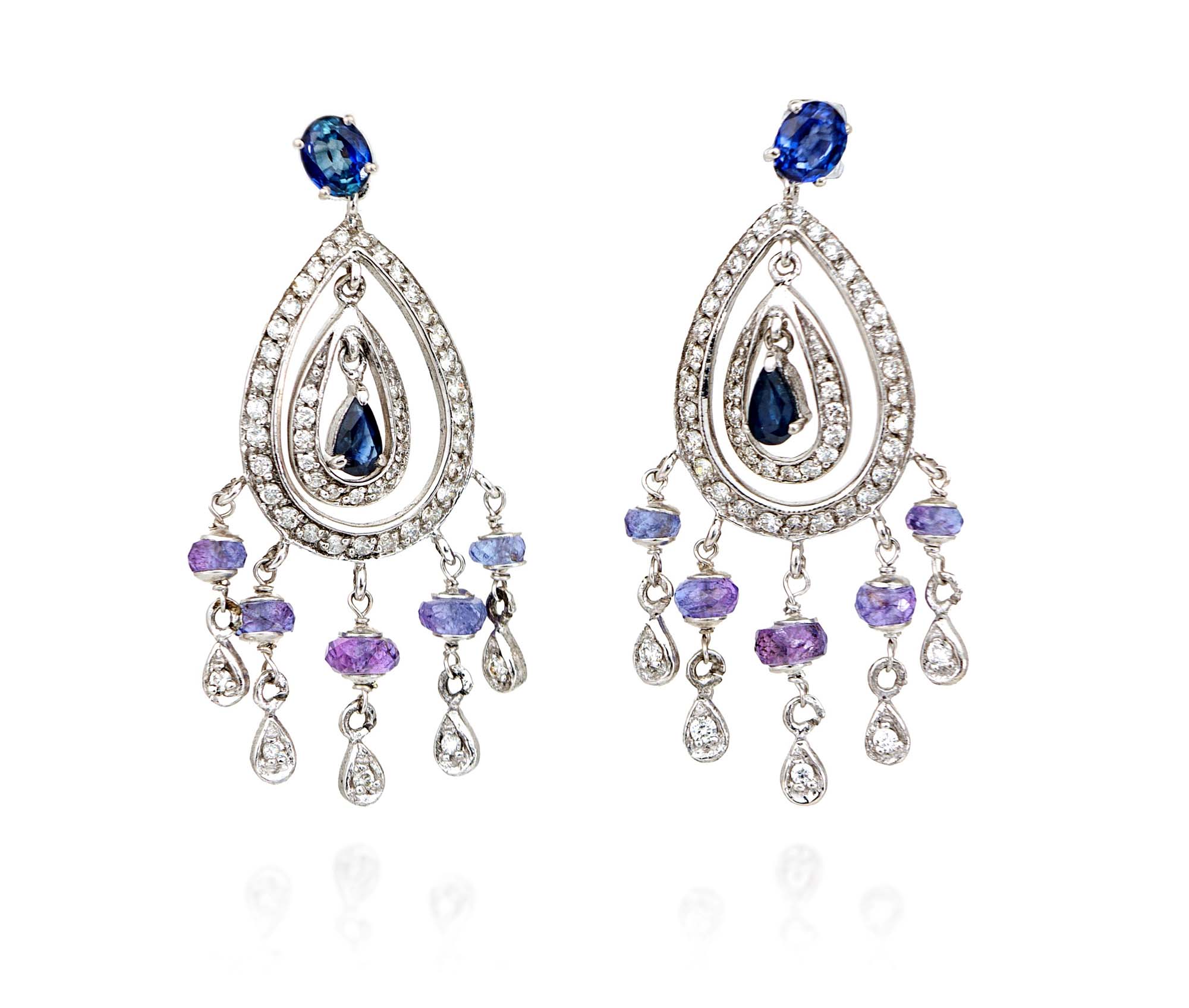Coppia di orecchini pendenti in oro, zaffiri e brillanti Oro bianco 750/000. Diamanti in taglio rotondo brillanti ct. 1,20 ca. e zaffiri. Peso complessivo gr. 10,60. Lunghezza cm 5