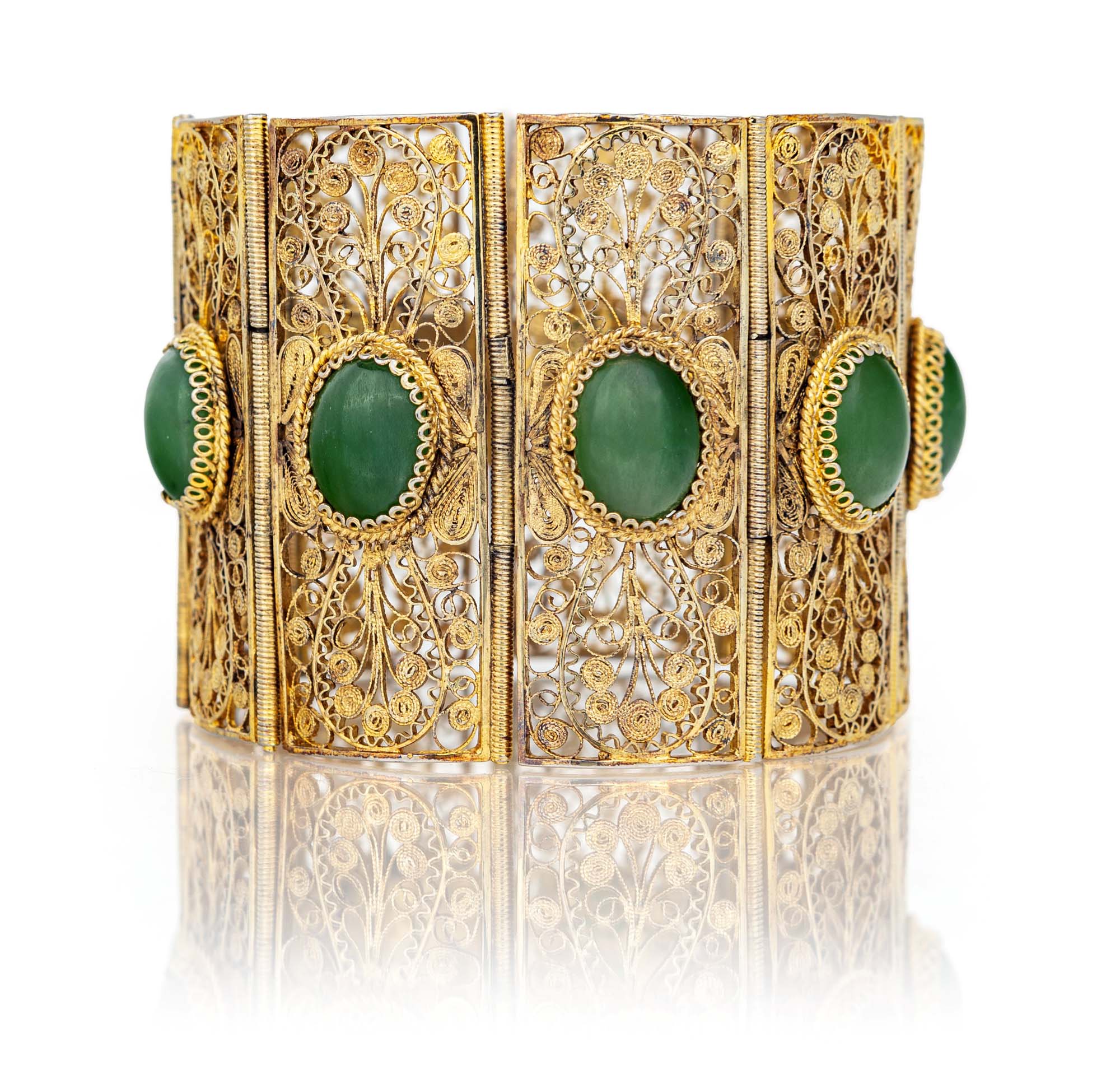 Bracciale in argento dorato e giade Argento 800/000. Punzoni del fascio littorio. Giade in taglio cabochon ct 36. ca. Peso complessivo gr. 77,30. Corredato di certificazione gemmologica IGN n° 33263 Lunghezza cm 18,5, altezza cm 5,5